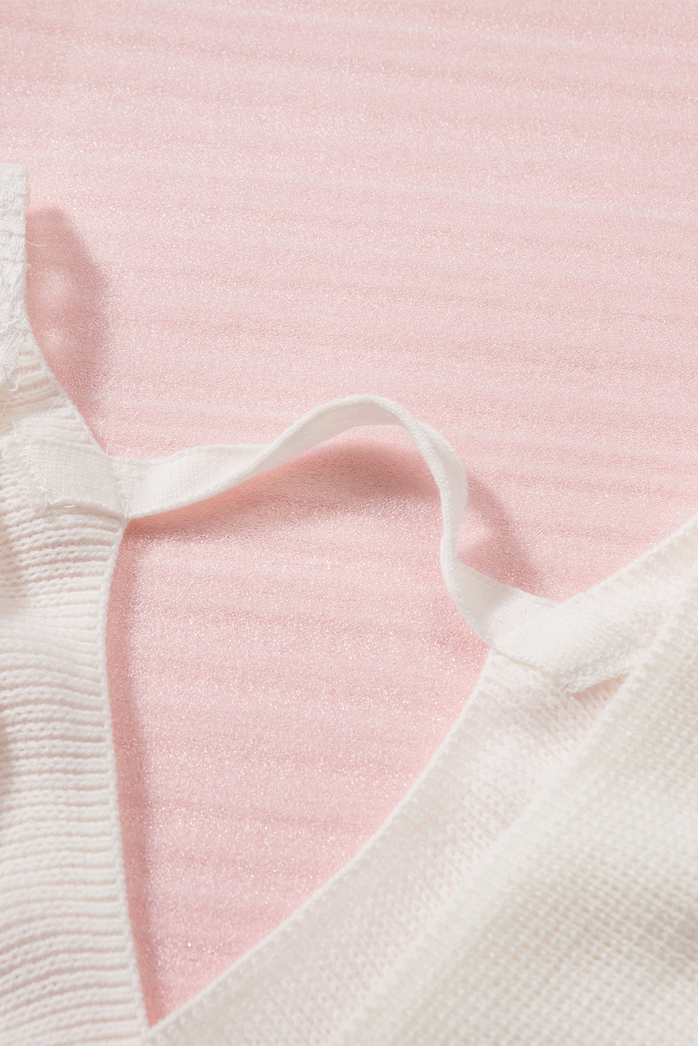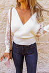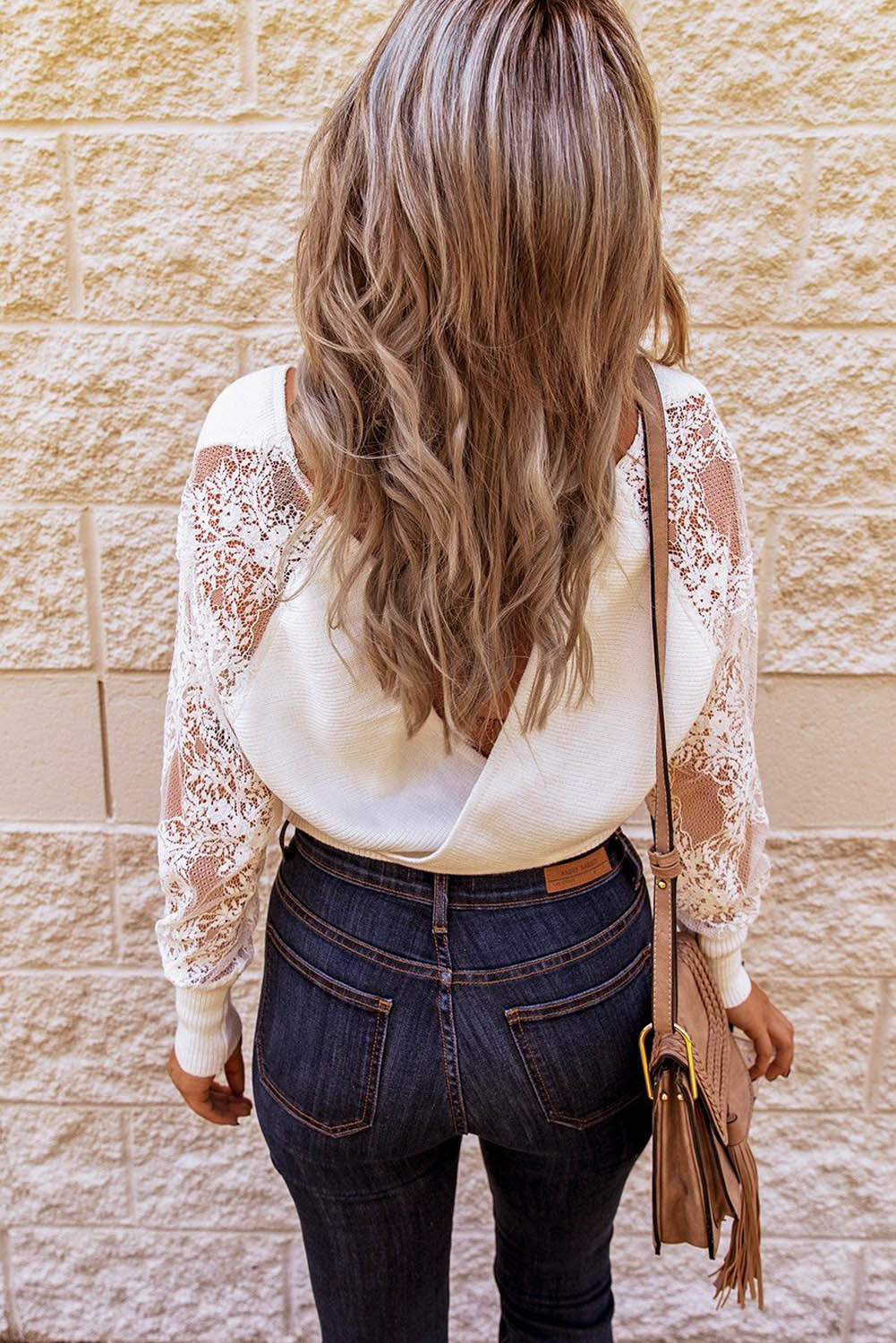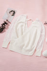 White Sexy V Neck Surplice Hollow-out Sweater with Lace Sleeves