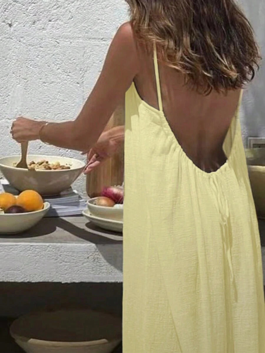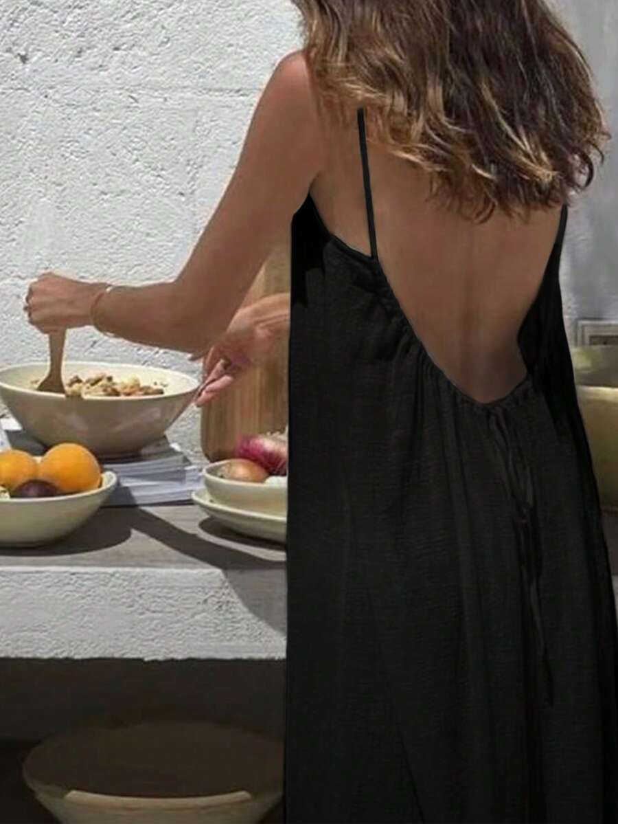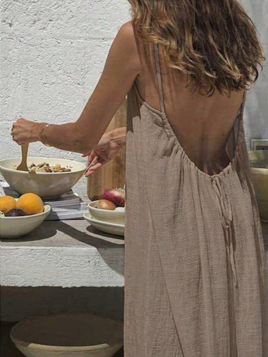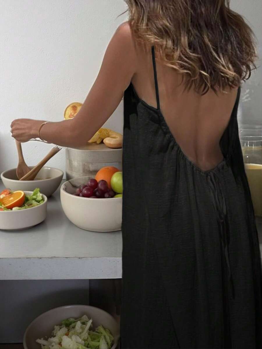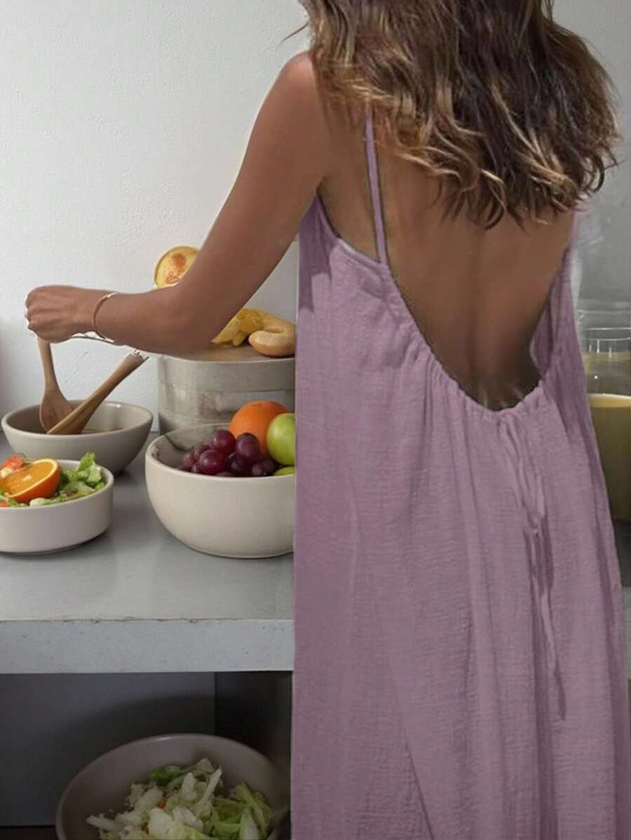 Cévolie Women's Solid Color Backless Tie Strap Casual Long Dress