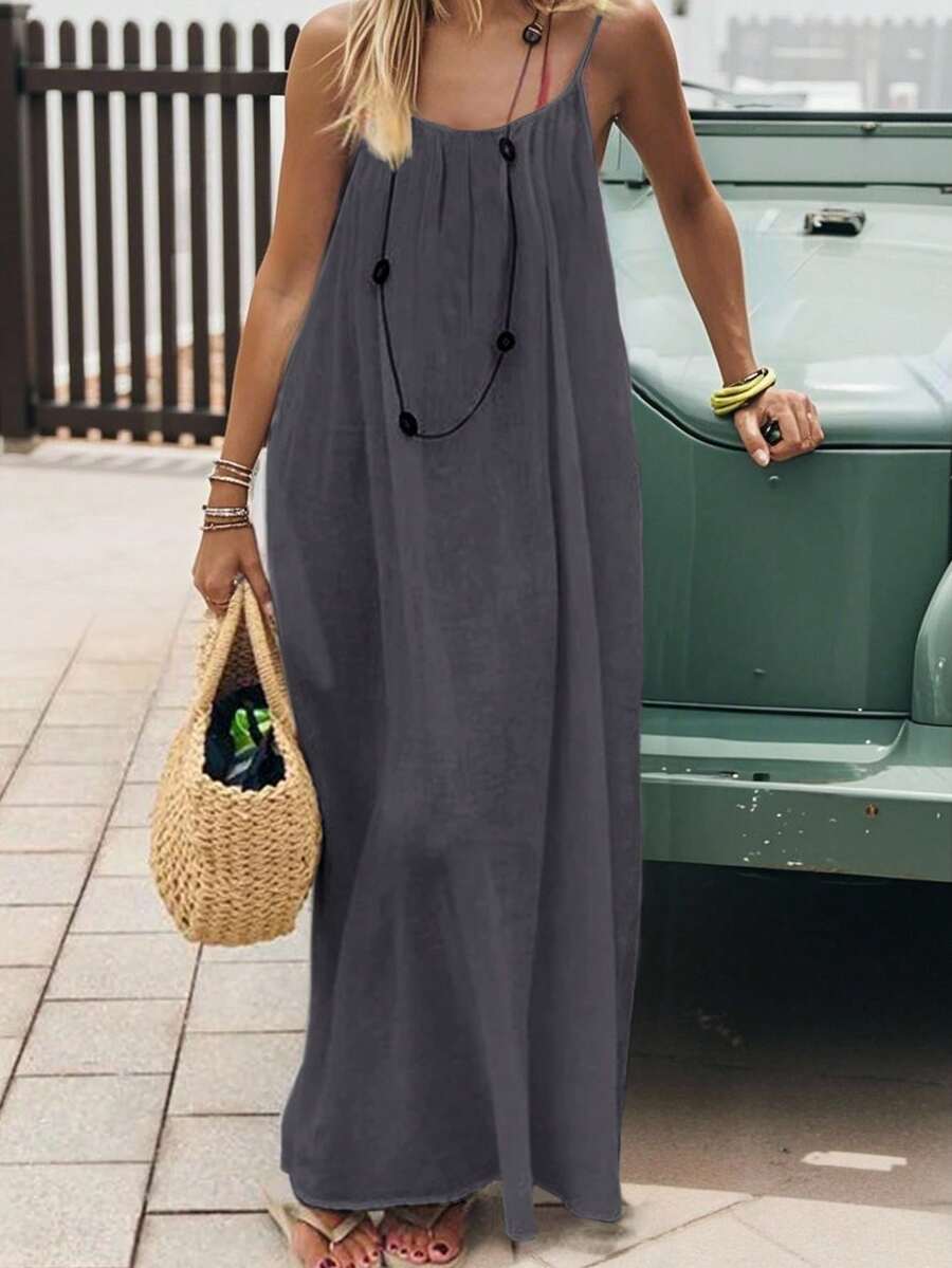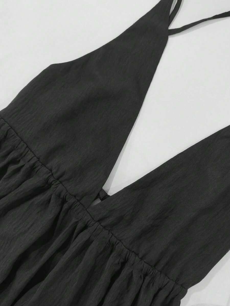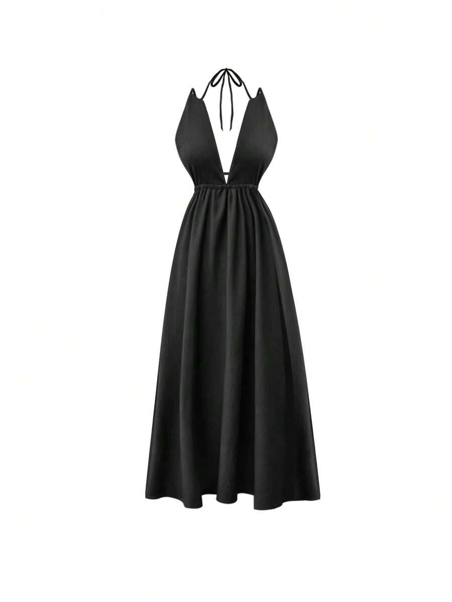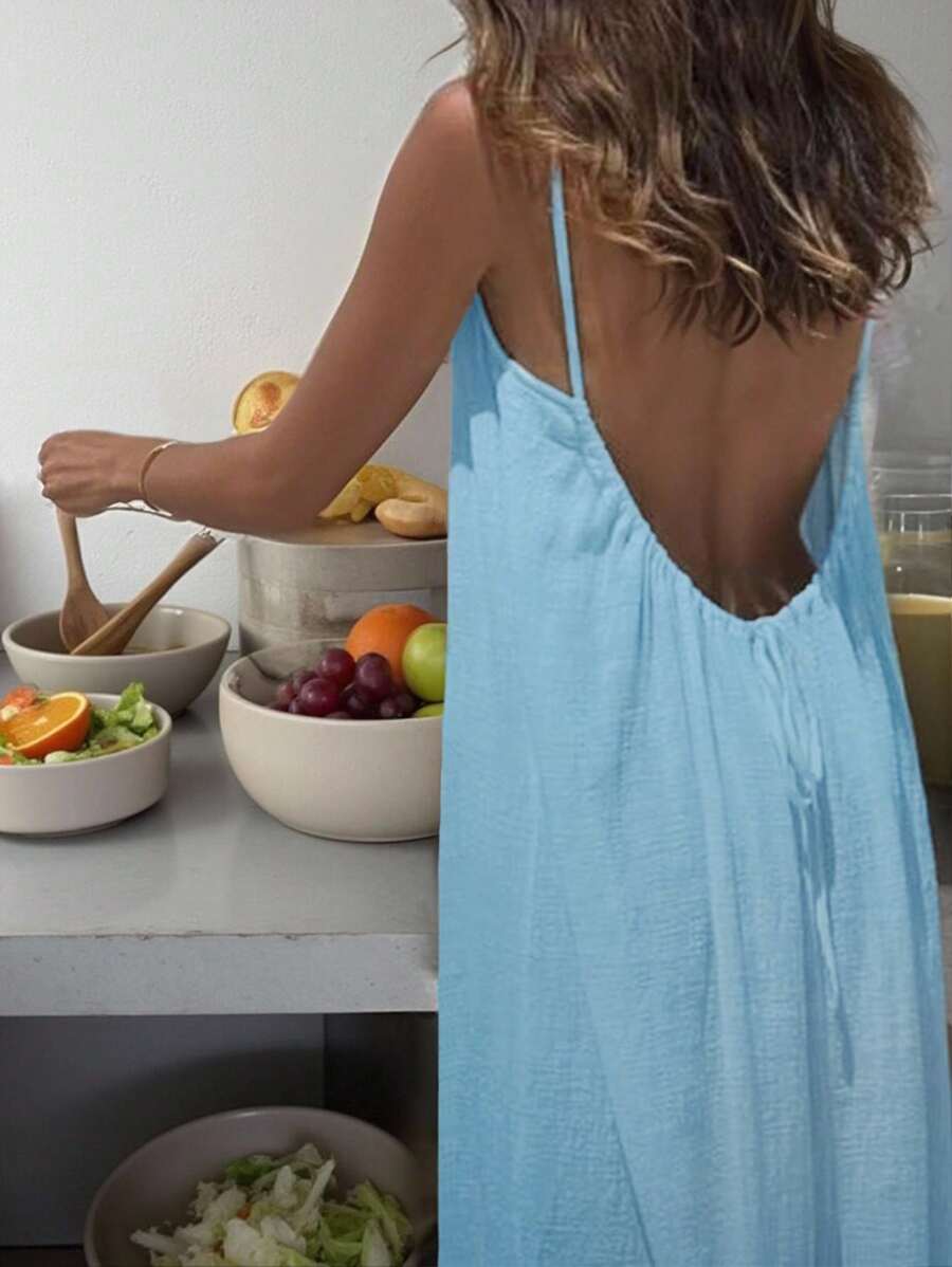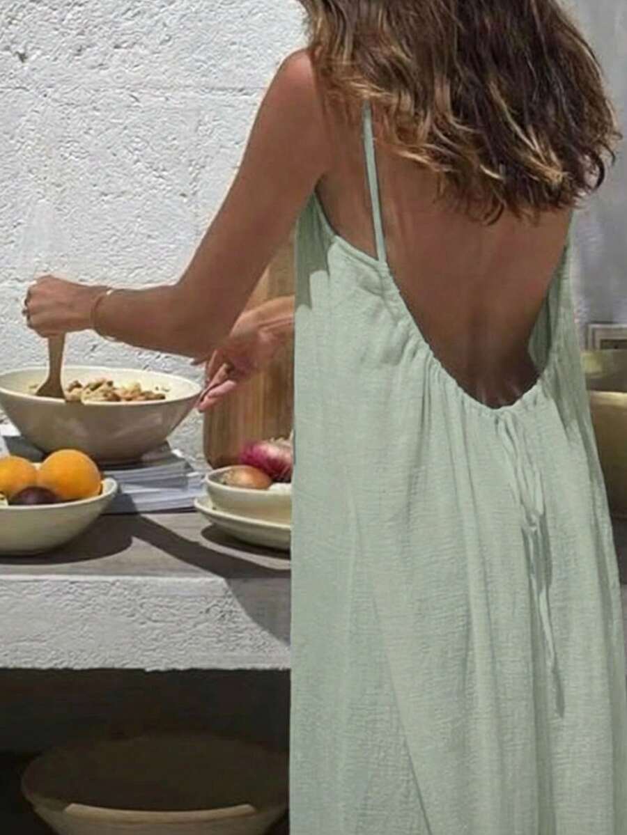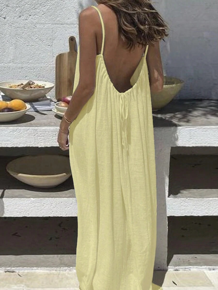Cévolie Women's Solid Color Backless Tie Strap Casual Long Dress