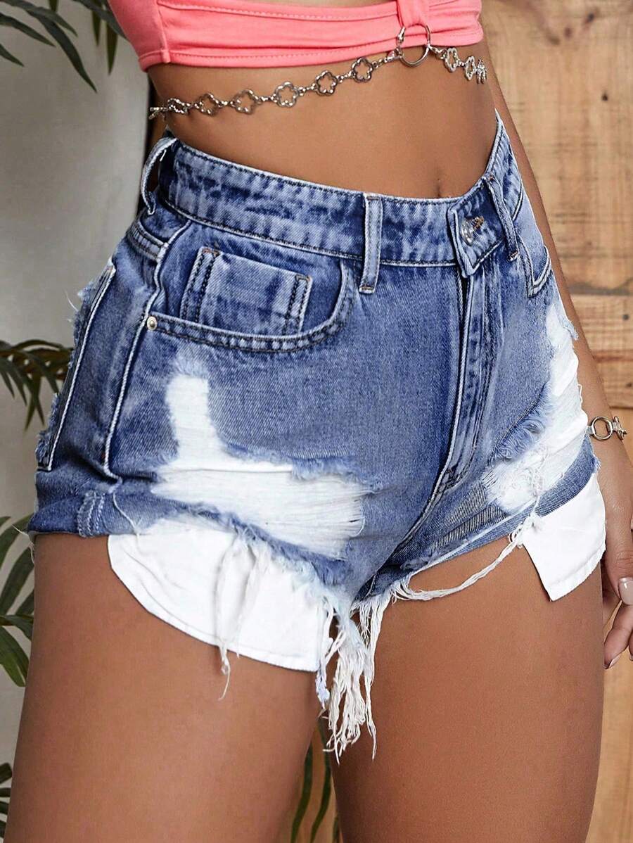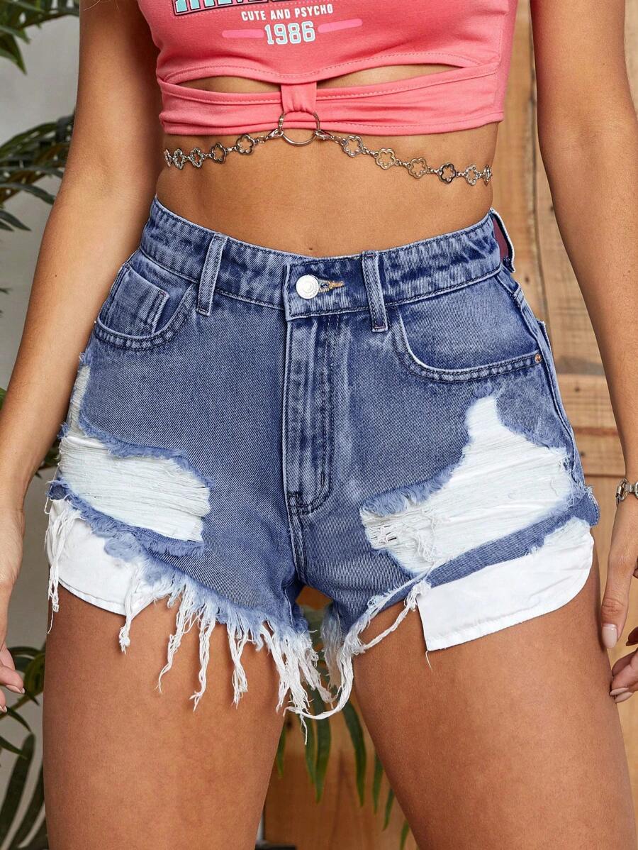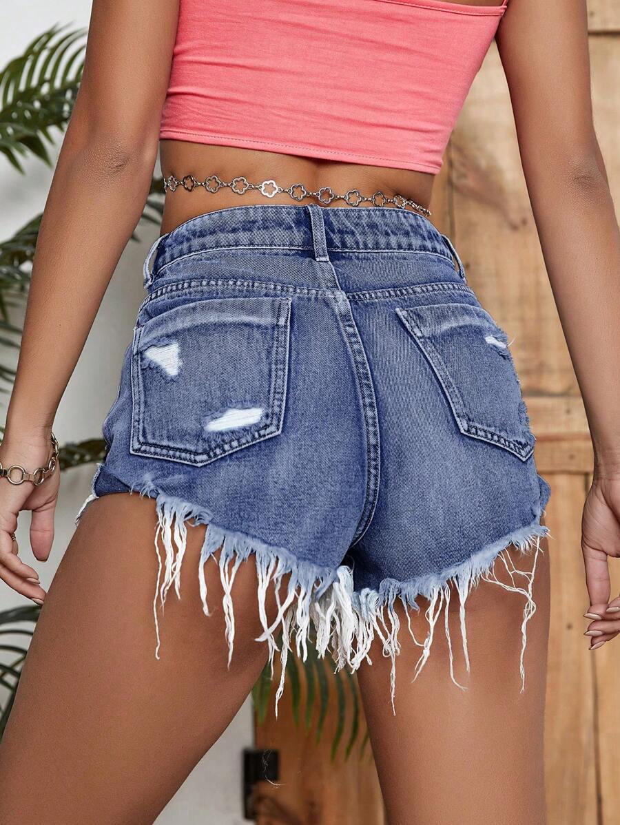 SHEIN Essnce Ripped Raw Hem Denim Shorts