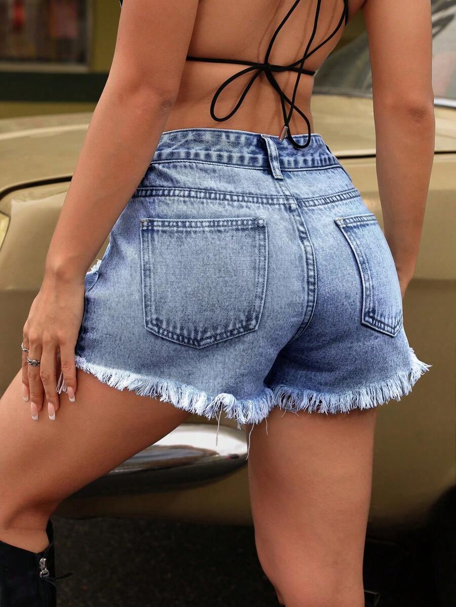 SHEIN ICON Summer Casual Washed Ripped Frayed Denim Shorts