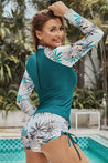 Our Palm Leaf Print Drawstring Ruched Two Pieces Long Sleeve UPF50+ Rash Guard is the perfect combination of style and sun protection. The beautiful palm leaf print and drawstring ruched design make it a fashionable choice, while the UPF50+ protection will keep your skin safe from harmful UV rays.