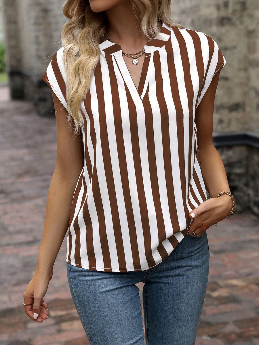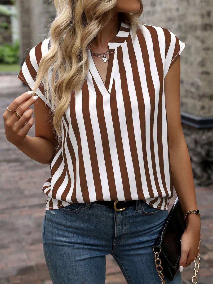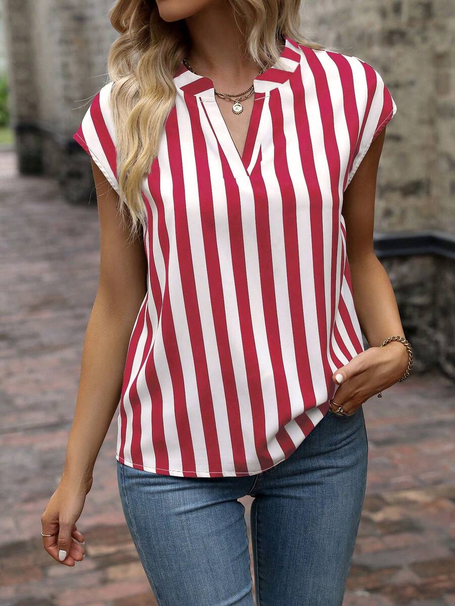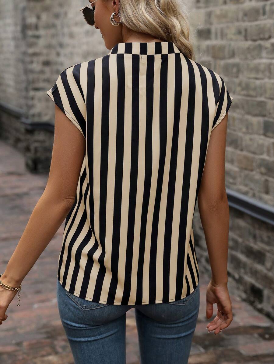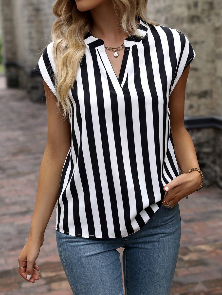 EMERY ROSE Notched V-Neck Stripe Print Elegant Office Wear Short Sleeve Blouse