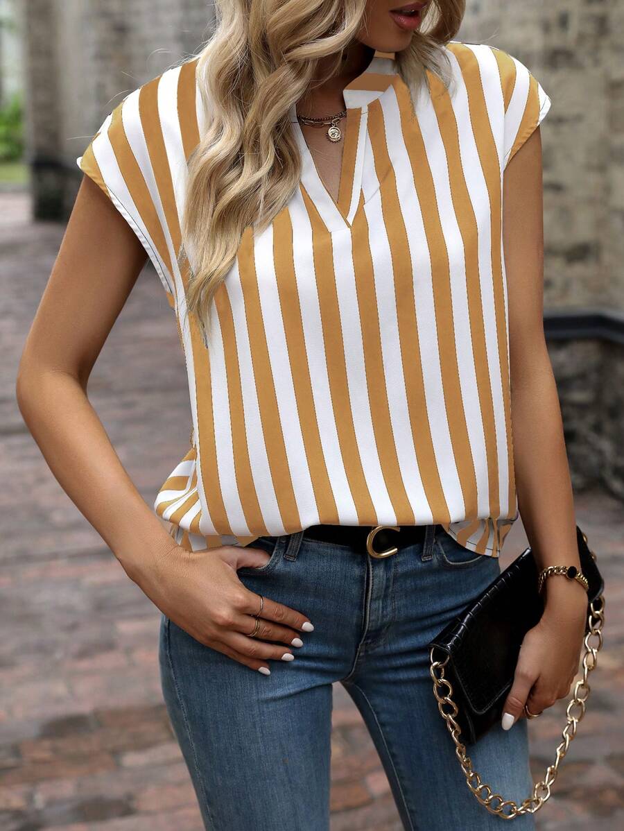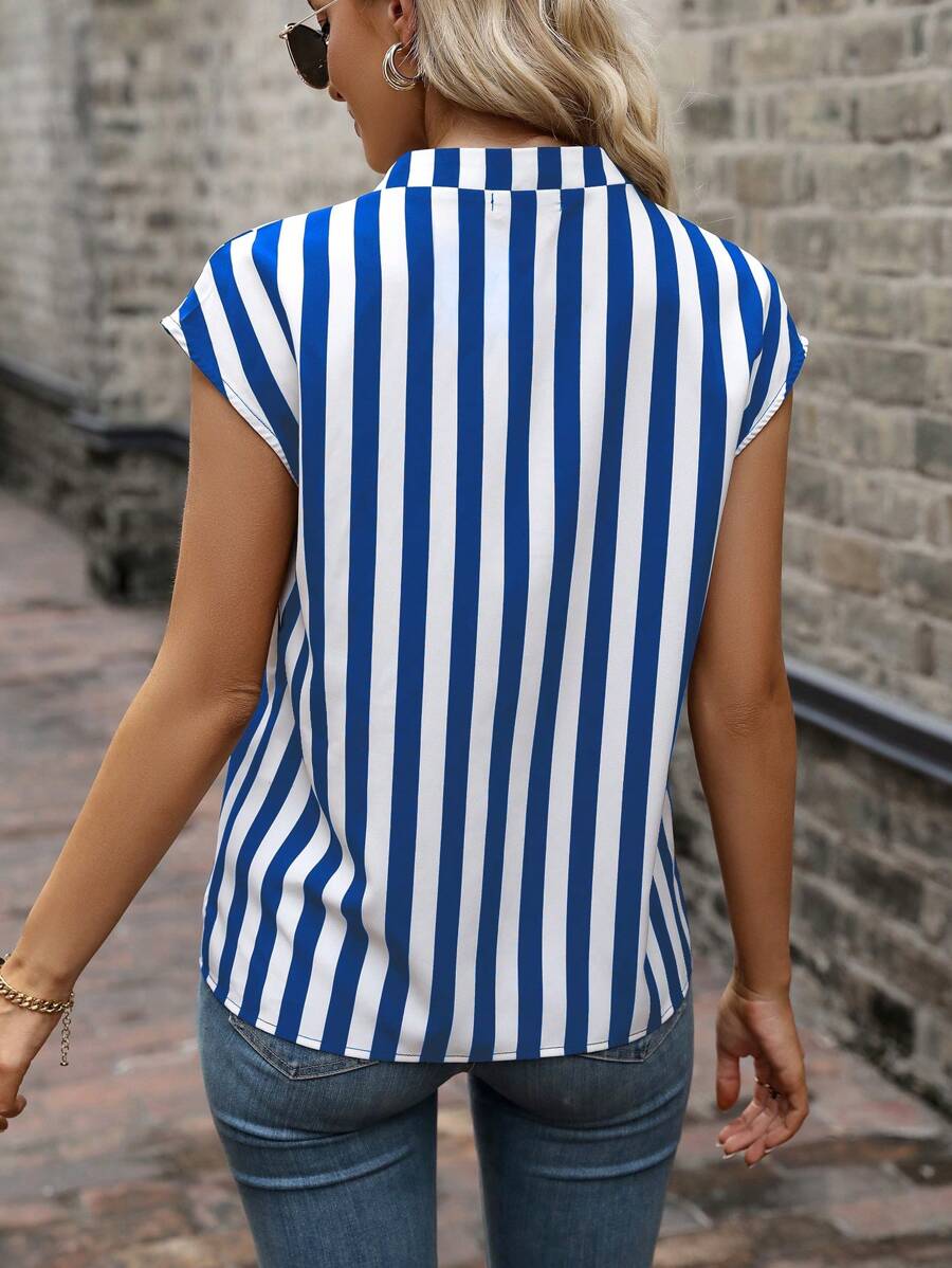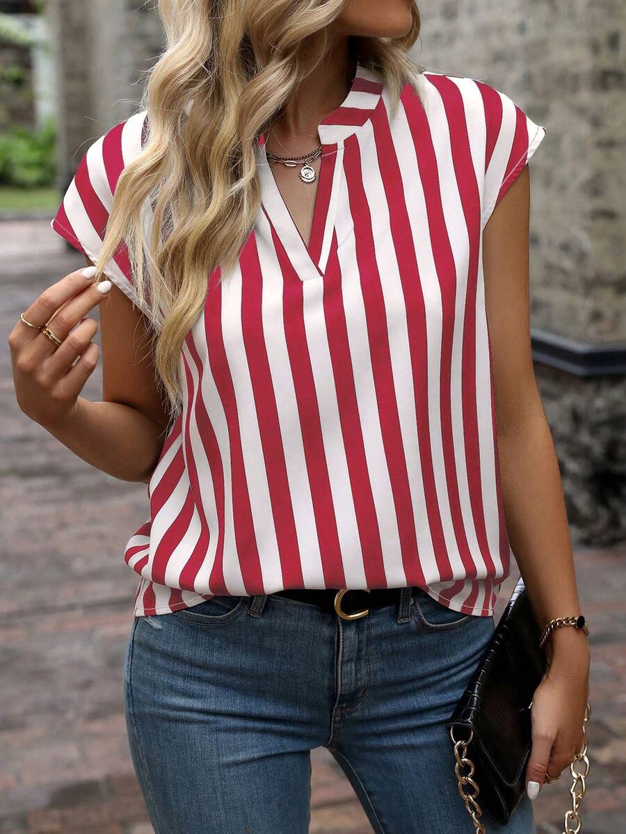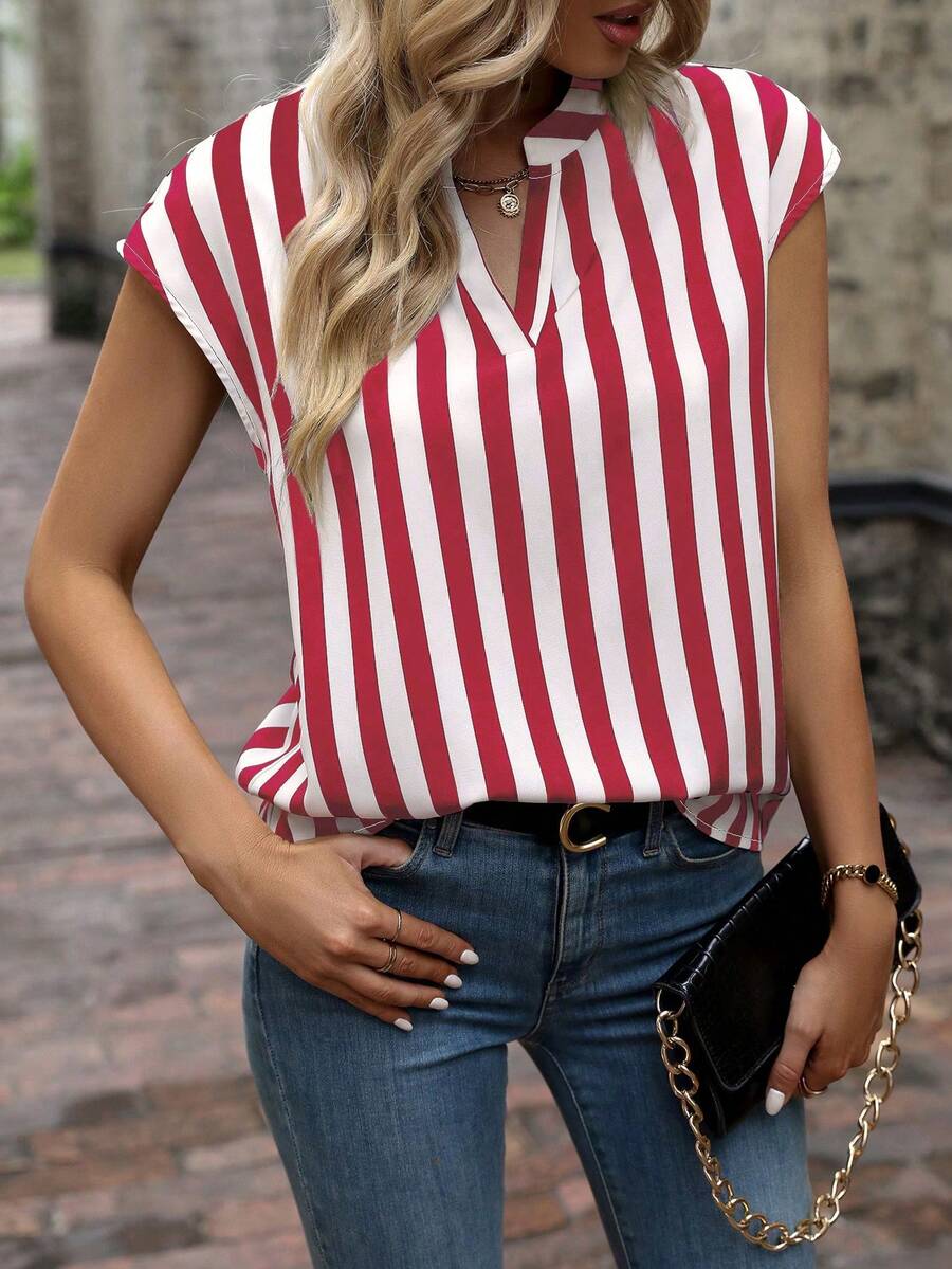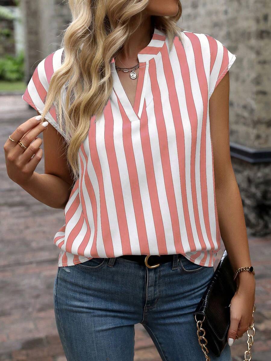 EMERY ROSE Notched V-Neck Stripe Print Elegant Office Wear Short Sleeve Blouse