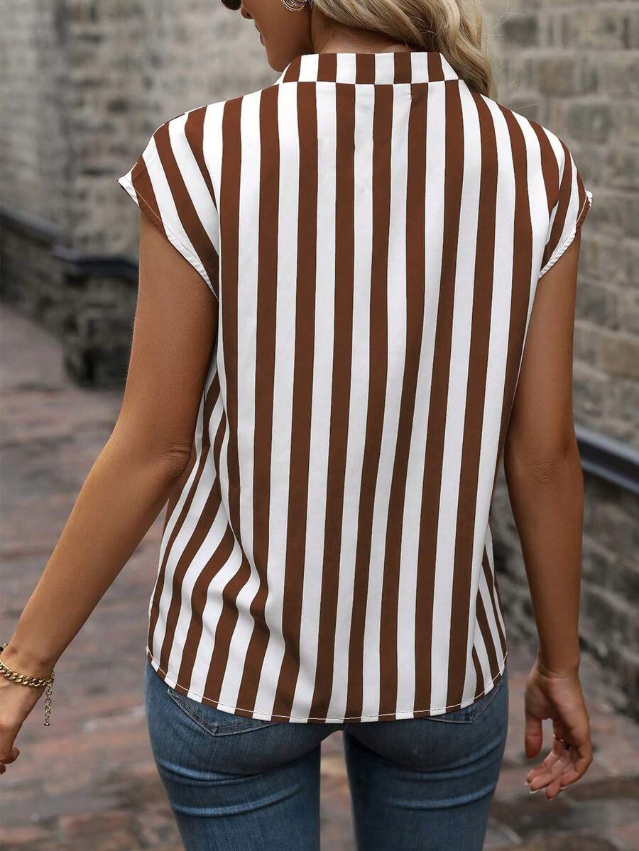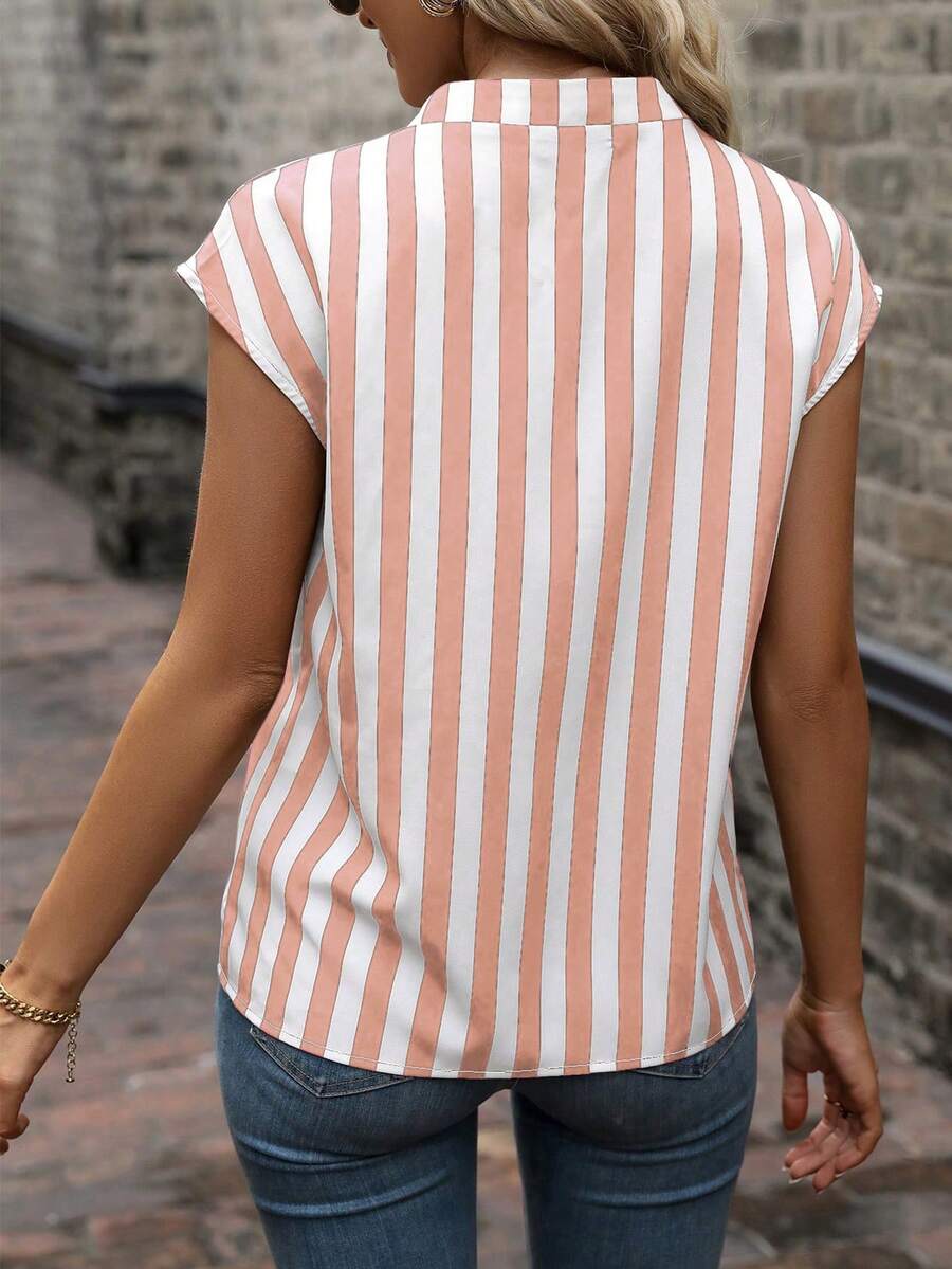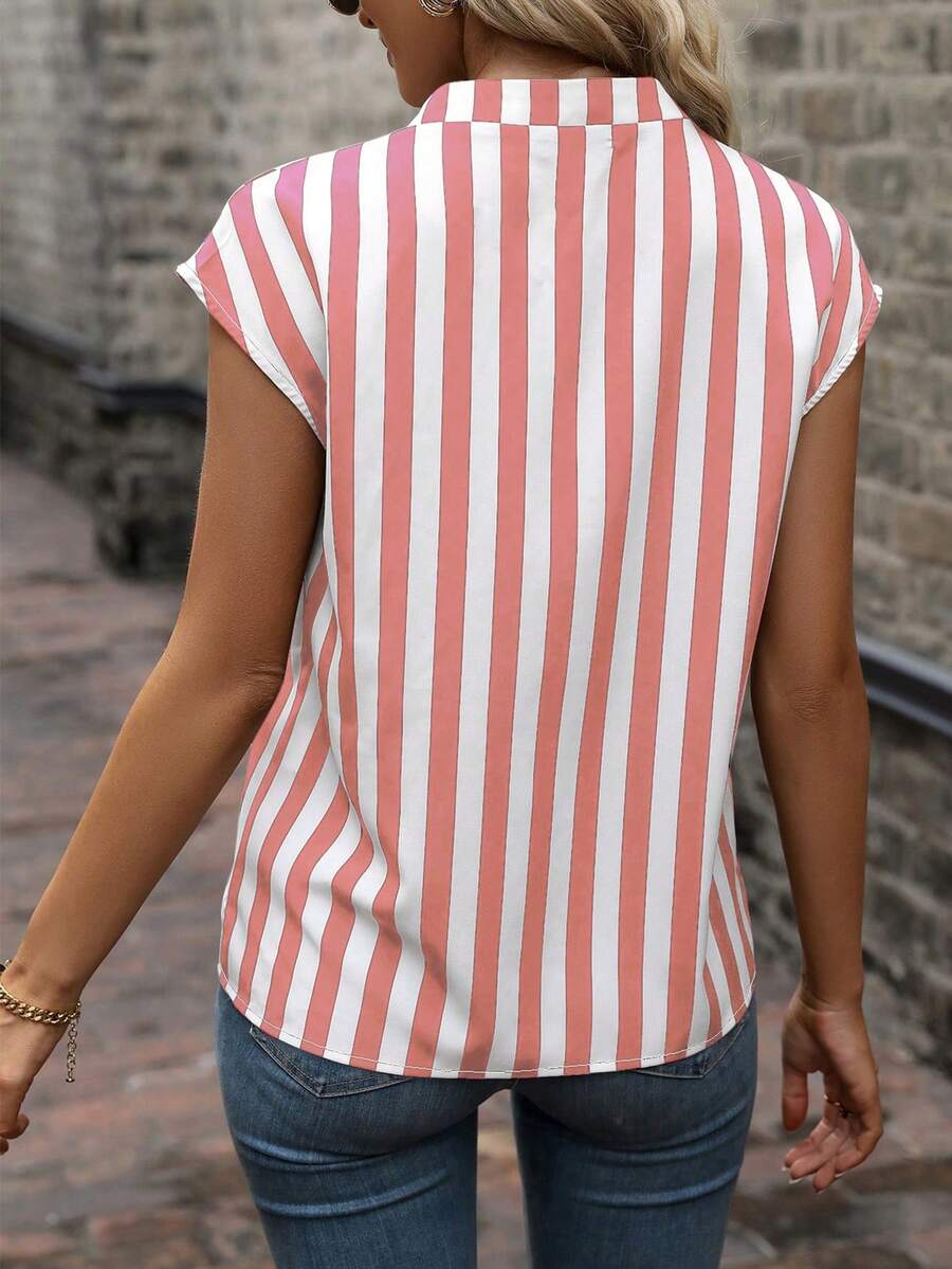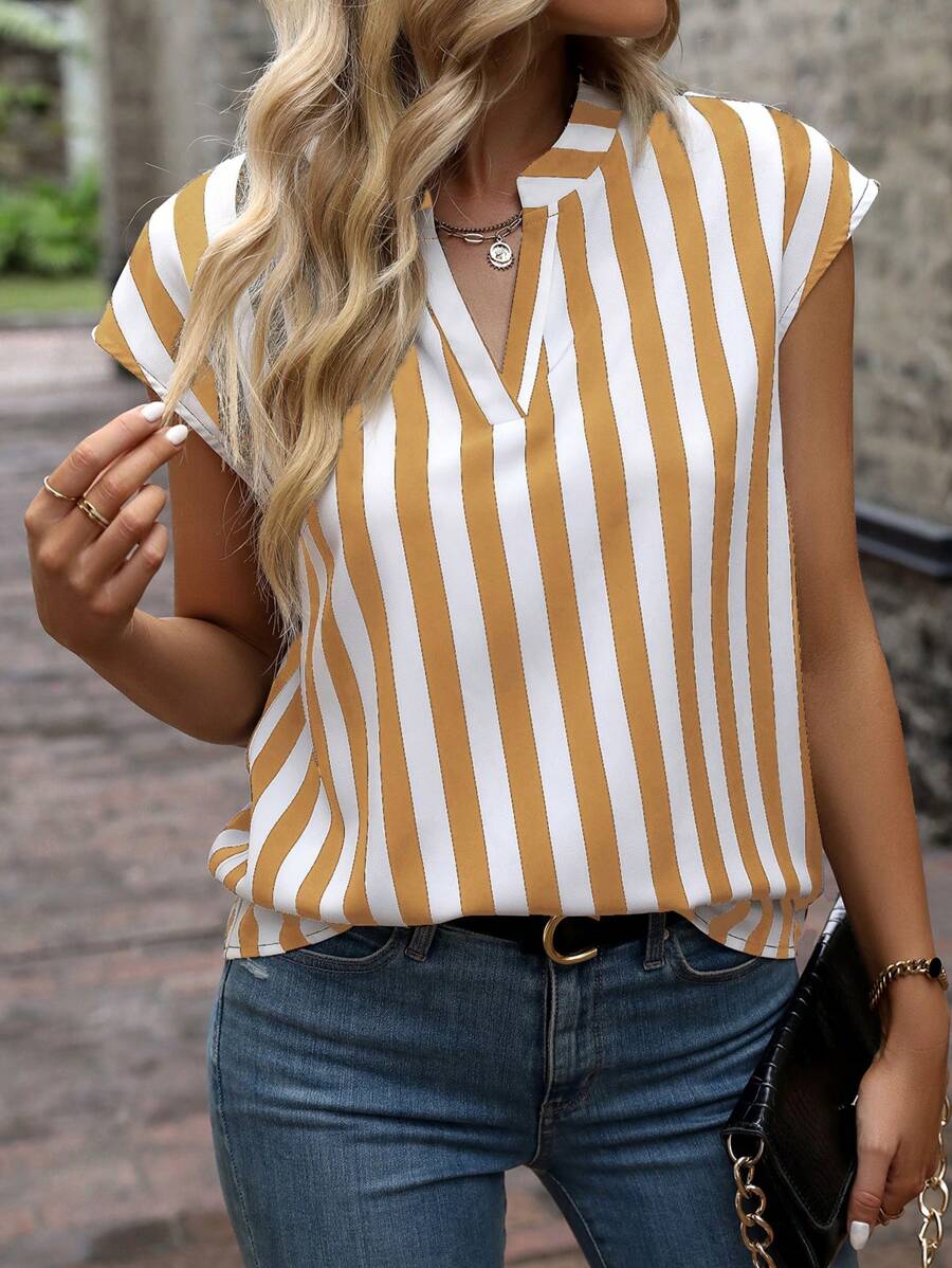EMERY ROSE Notched V-Neck Stripe Print Elegant Office Wear Short Sleeve Blouse