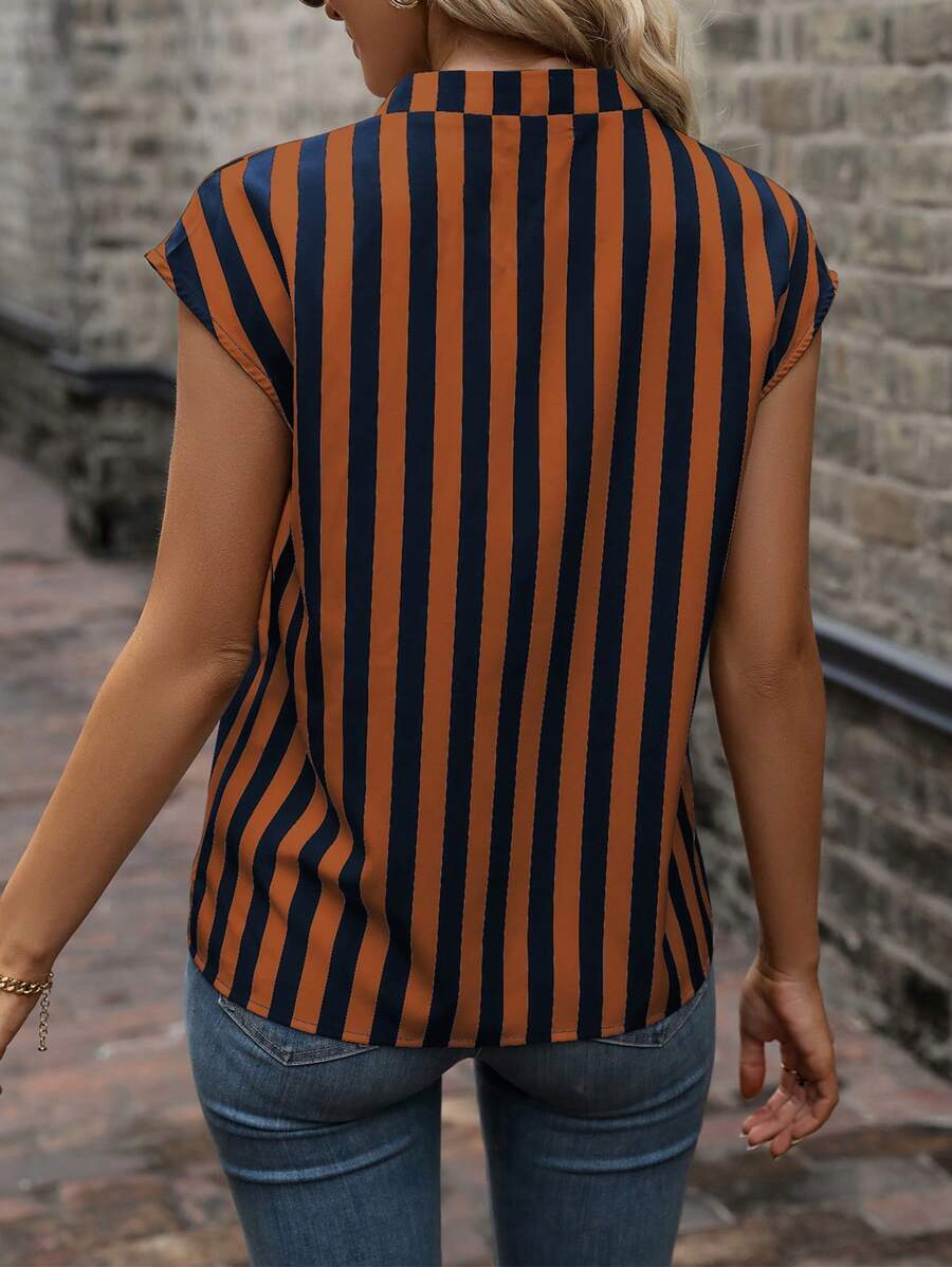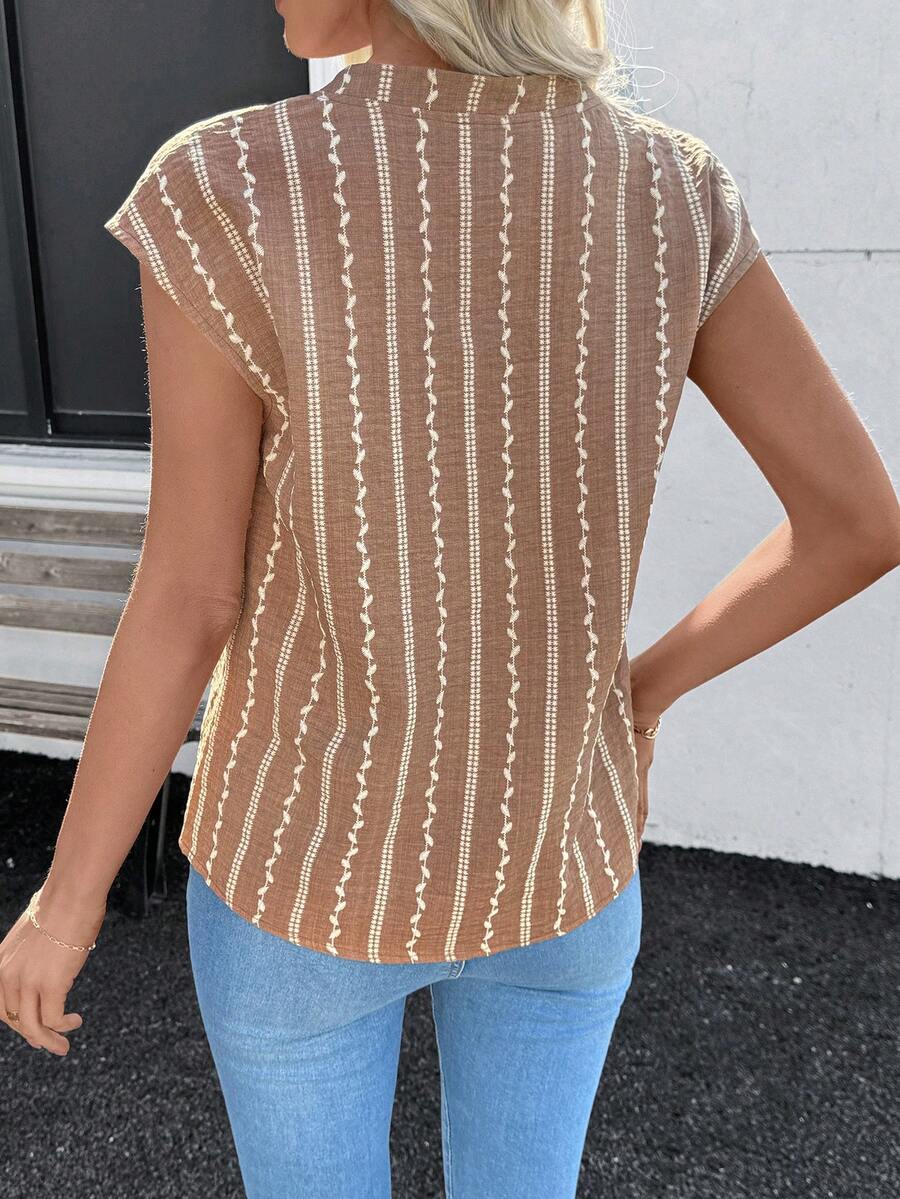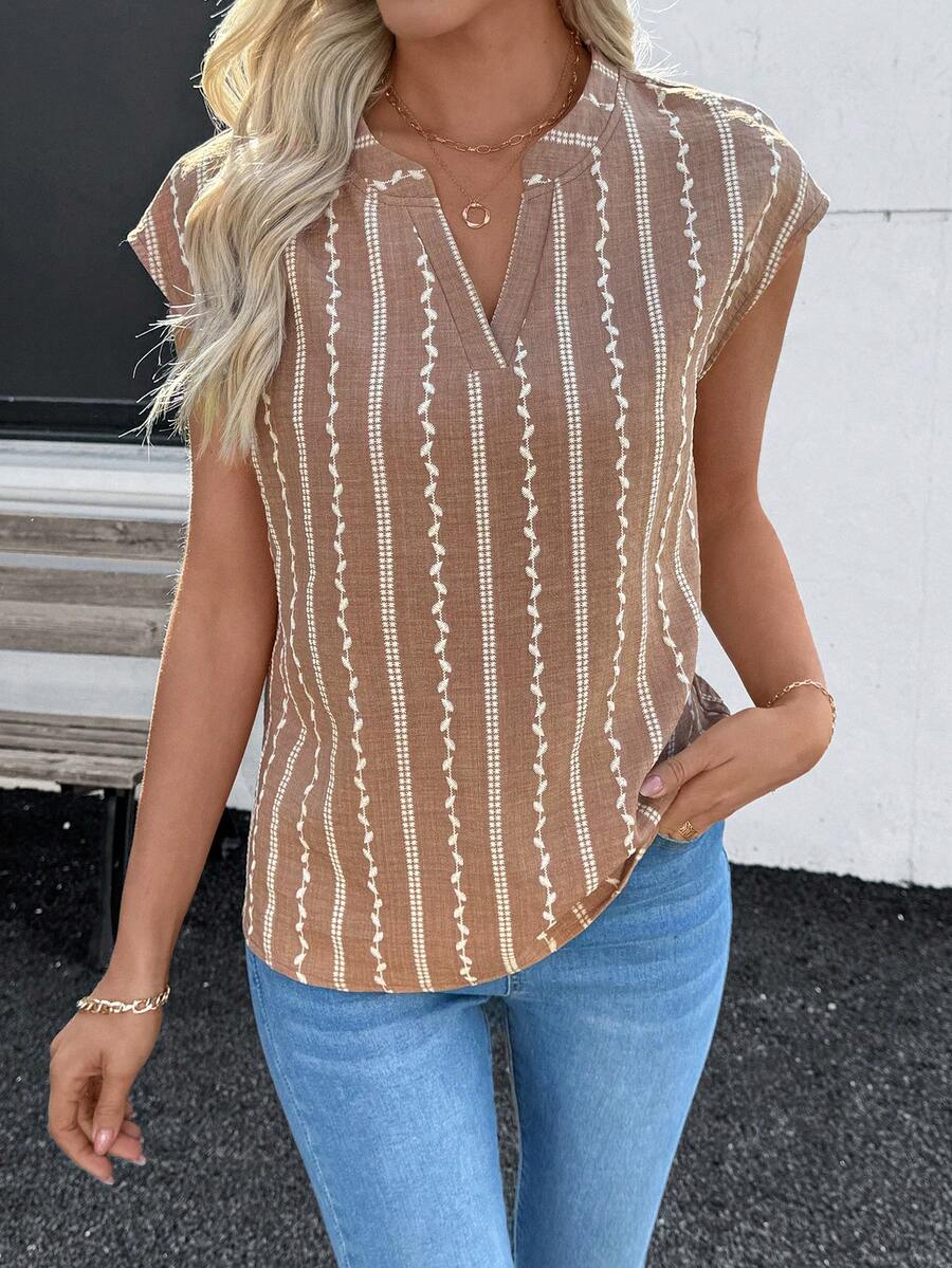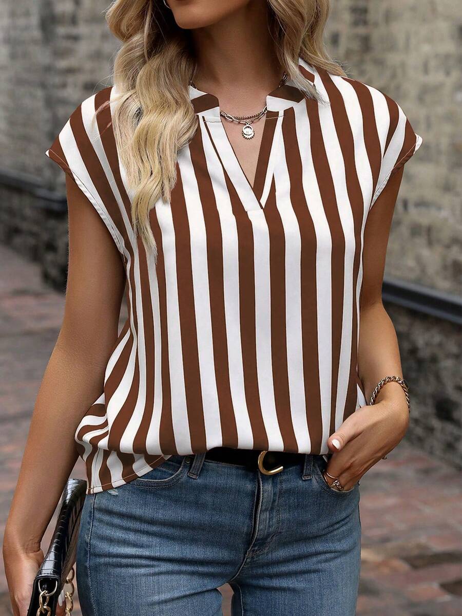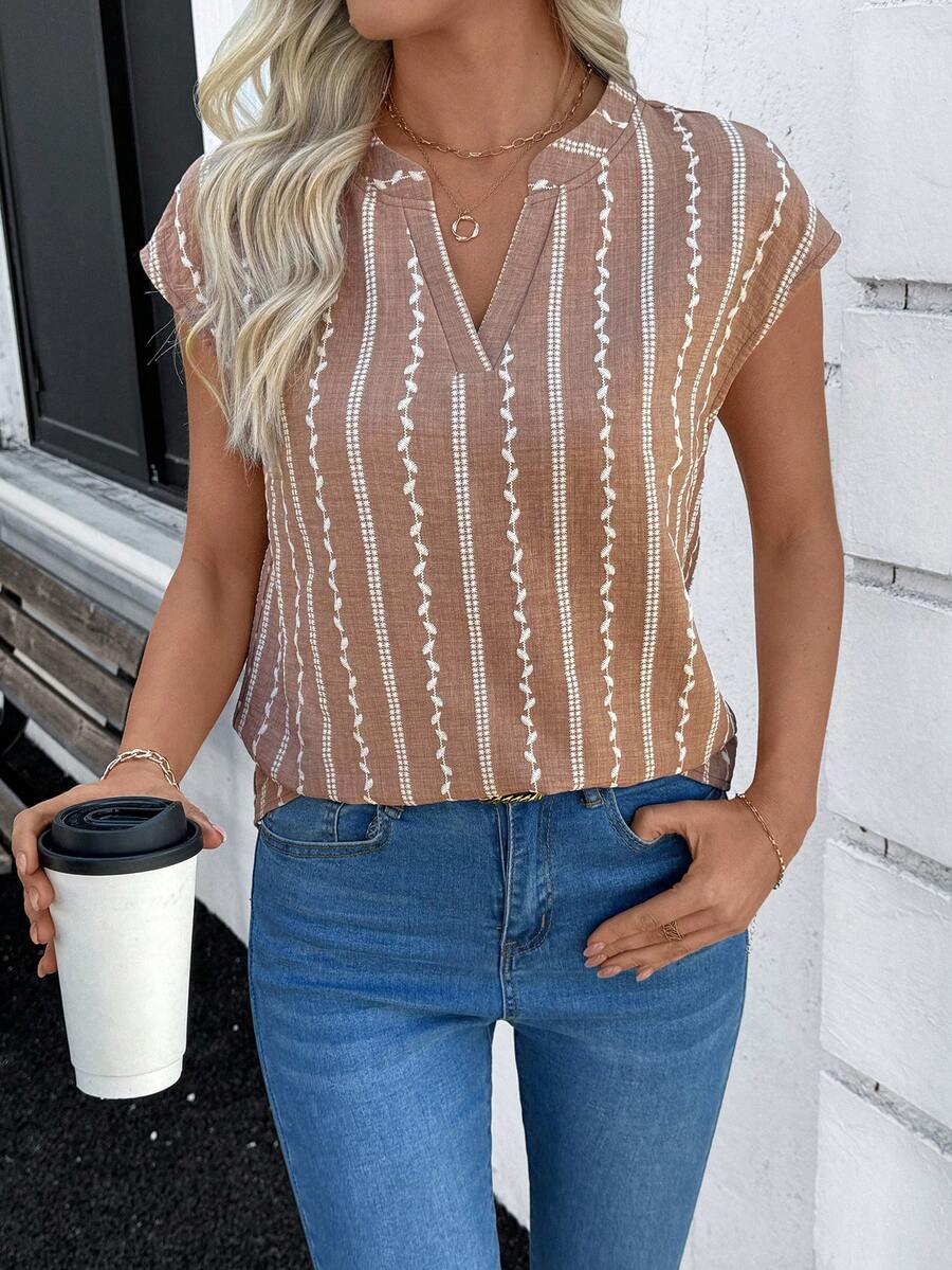 EMERY ROSE Notched V-Neck Stripe Print Elegant Office Wear Short Sleeve Blouse