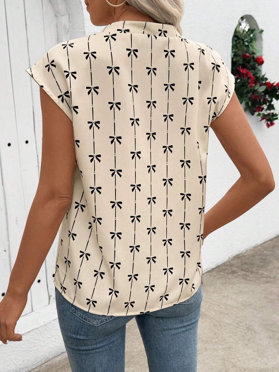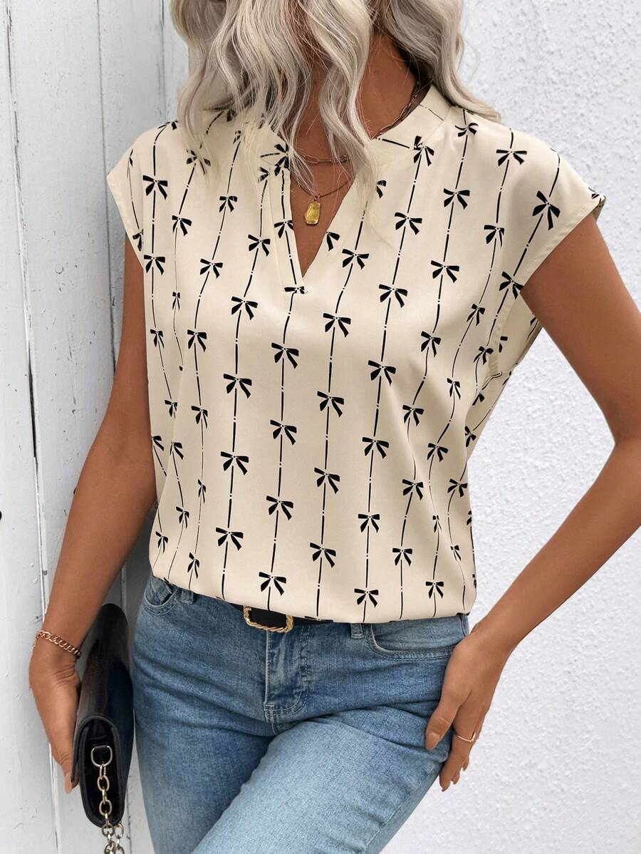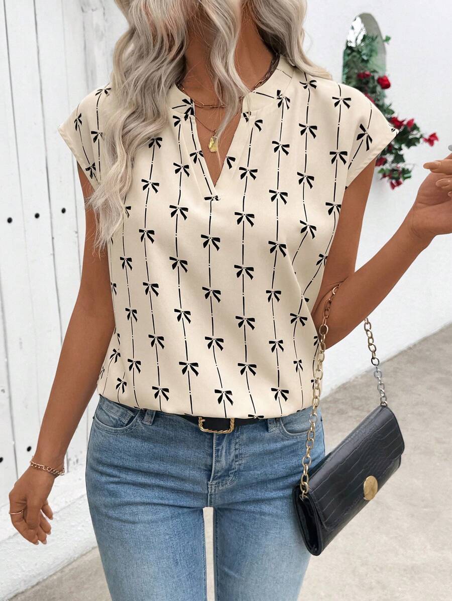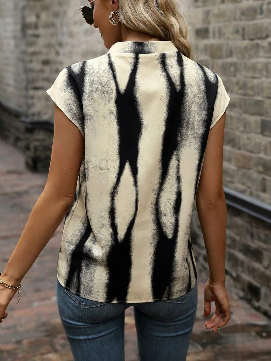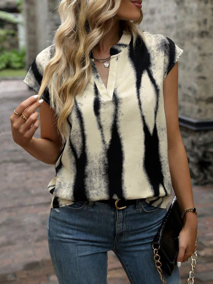 EMERY ROSE Notched V-Neck Stripe Print Elegant Office Wear Short Sleeve Blouse