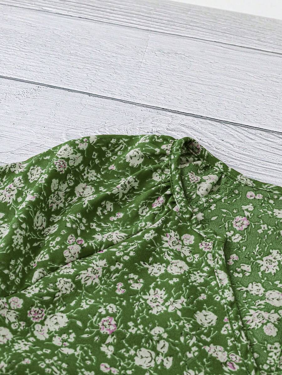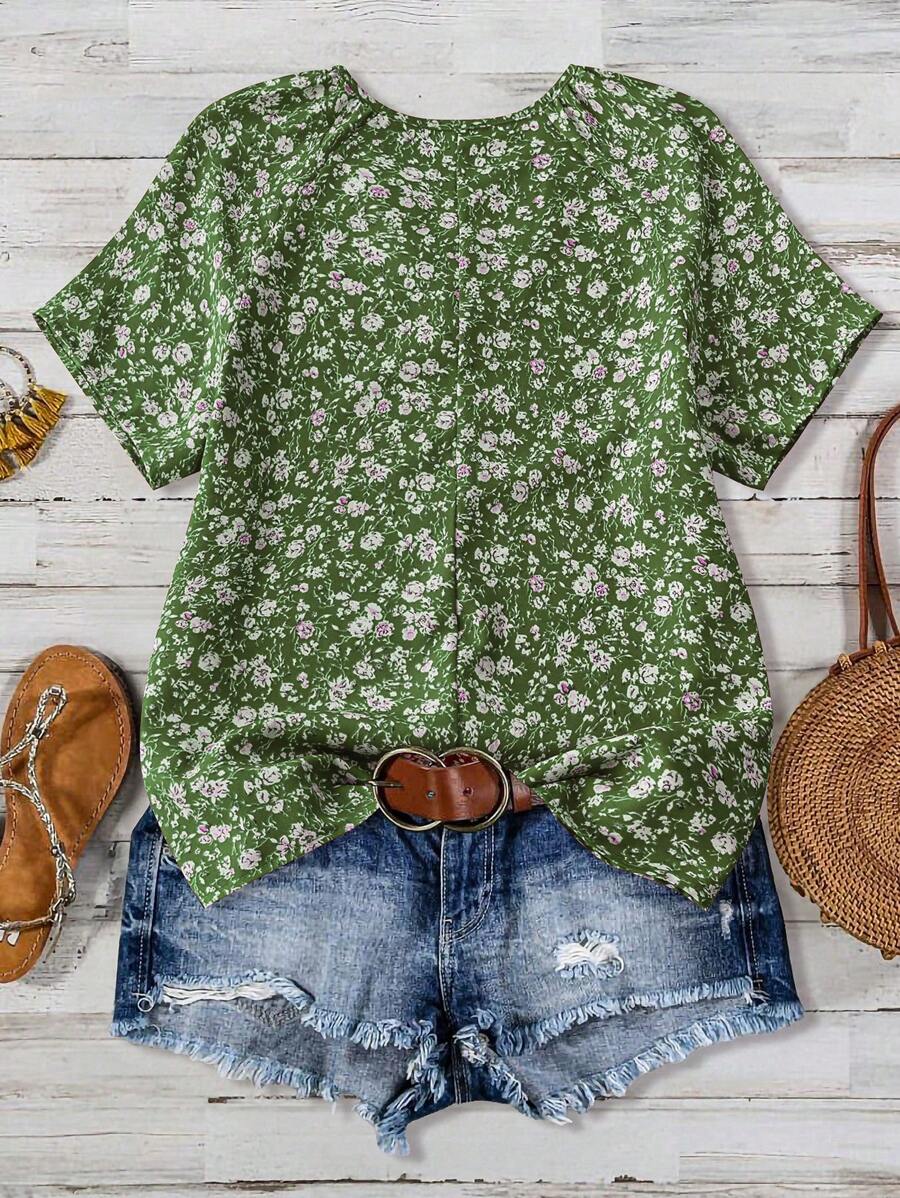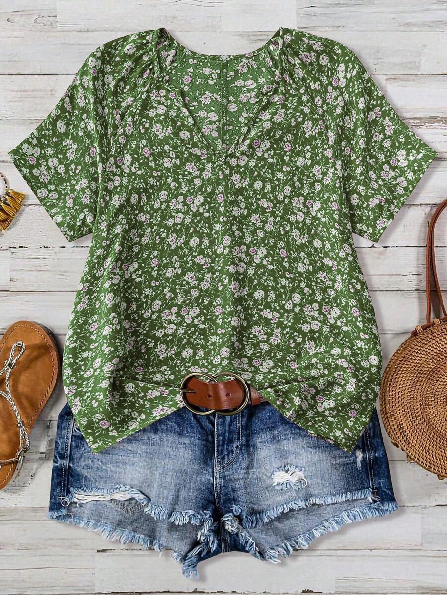 EMERY ROSE Women's V-Neck Short Sleeve Green Ditsy Floral Casual Top