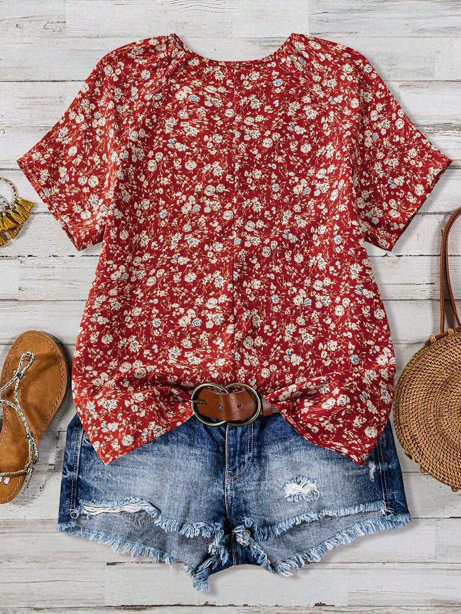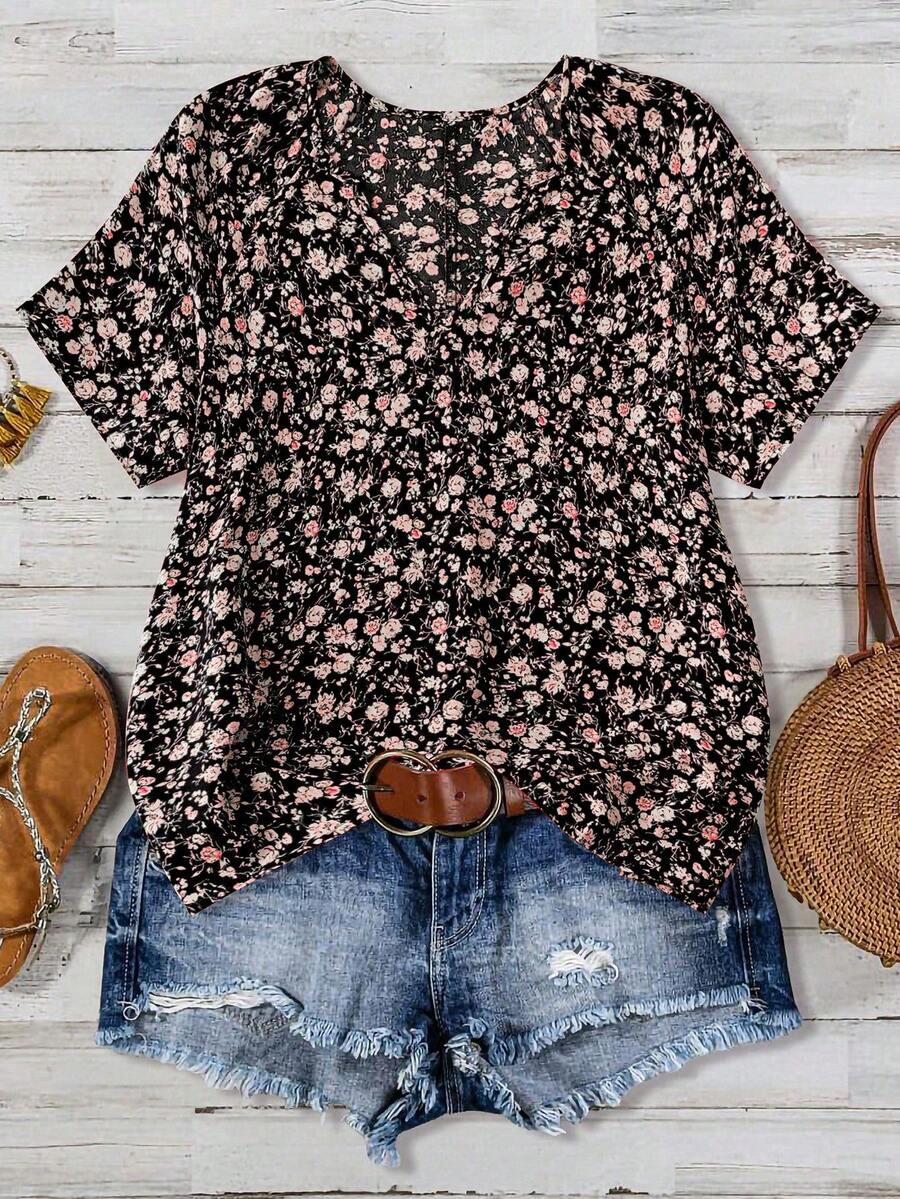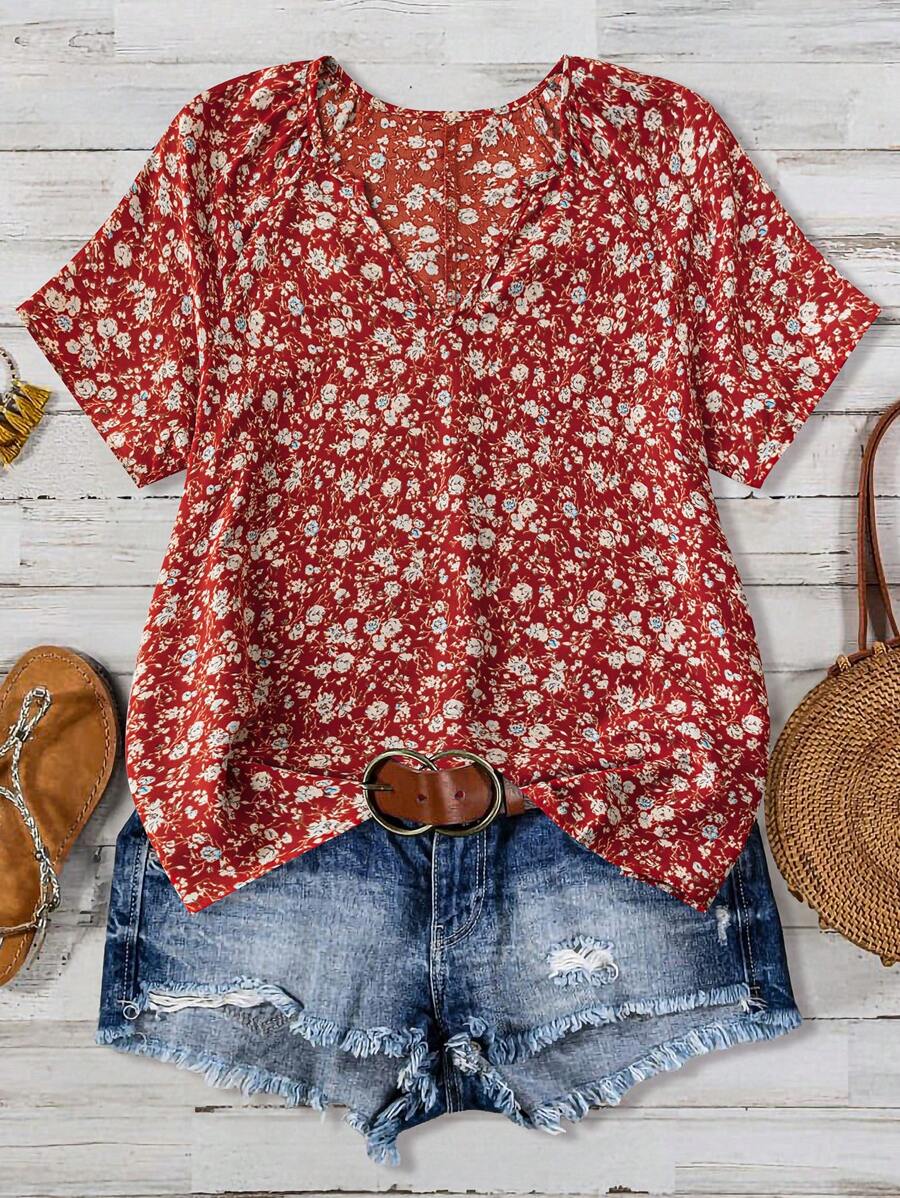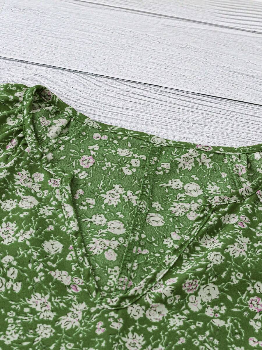 EMERY ROSE Women's V-Neck Short Sleeve Green Ditsy Floral Casual Top