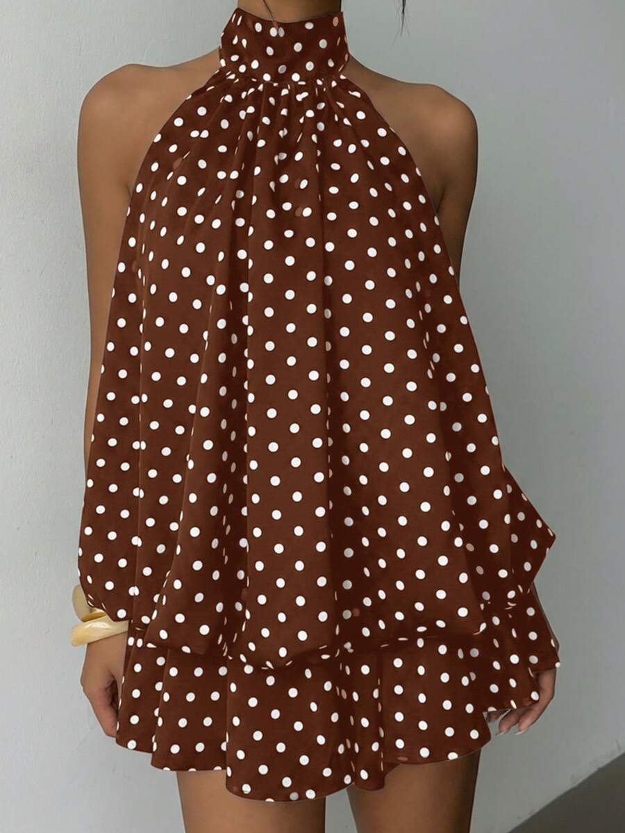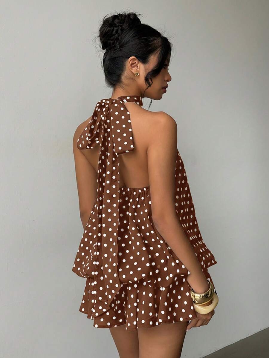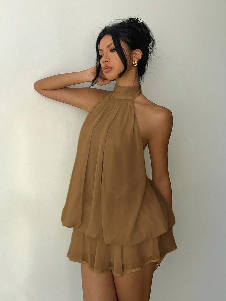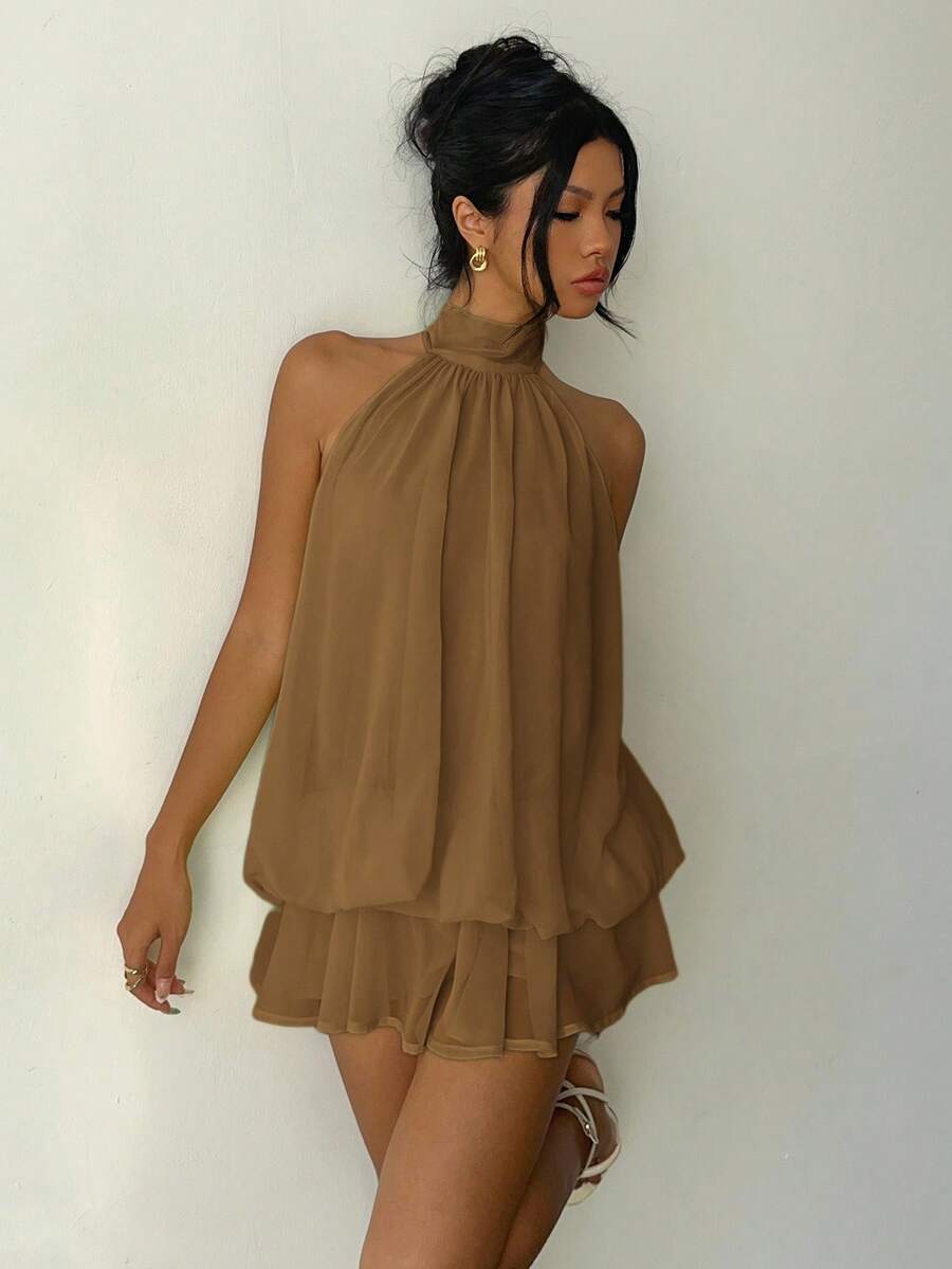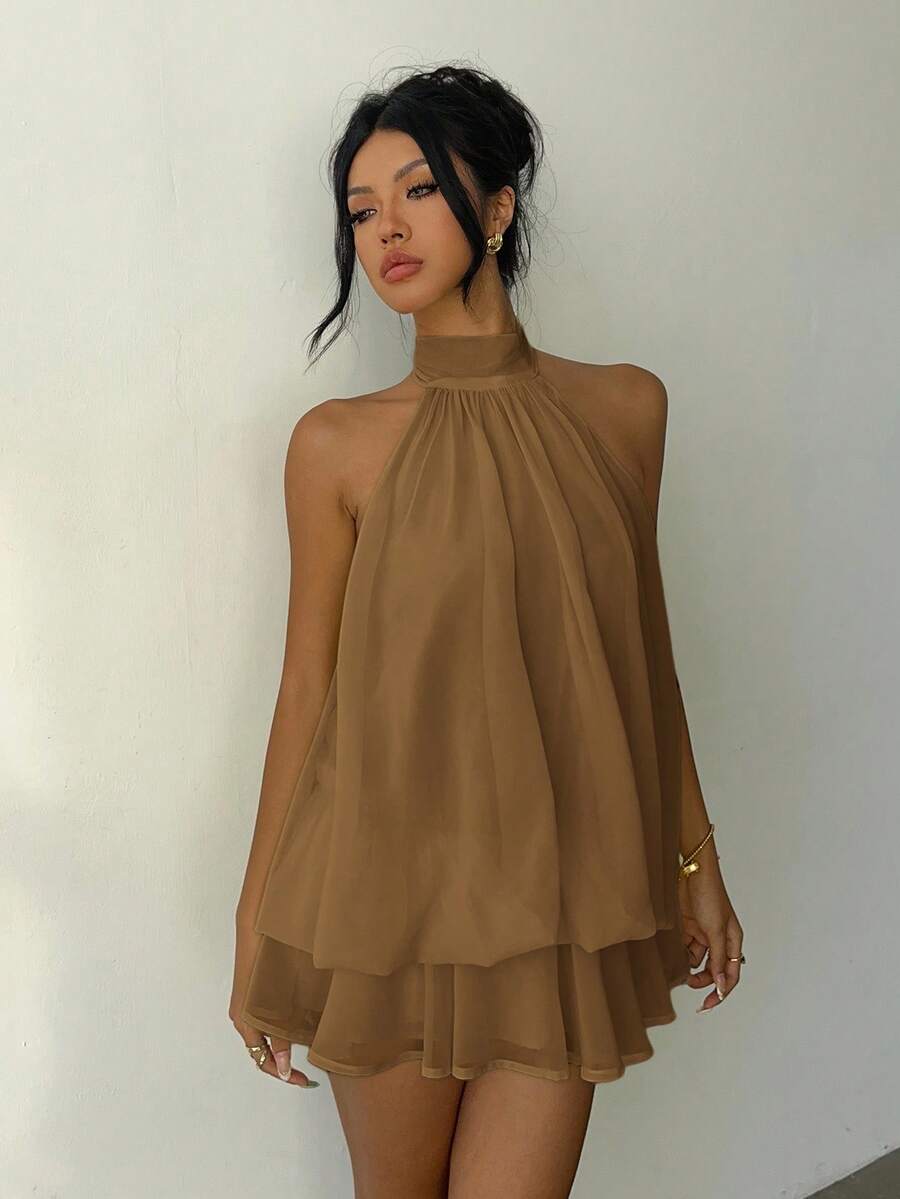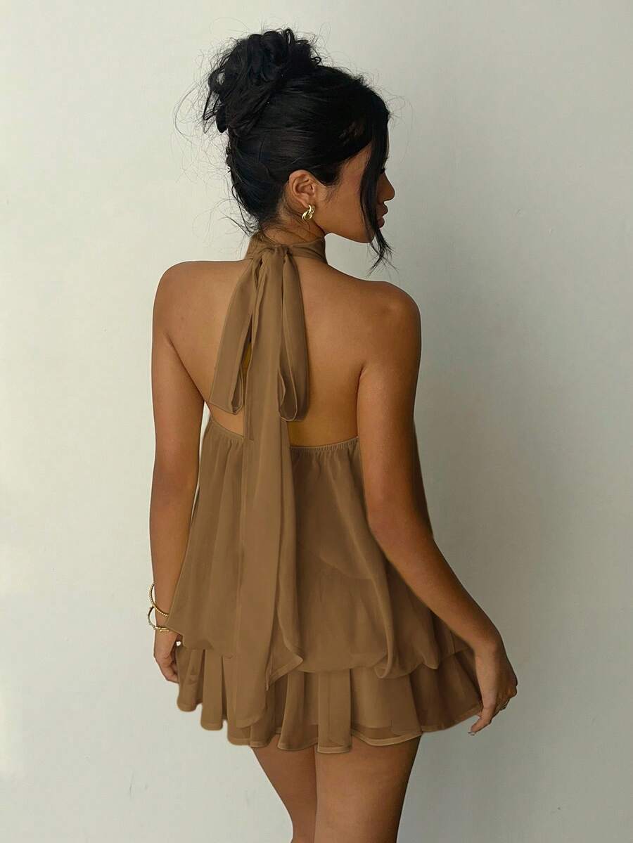 Aloruh Women's Elegant Brown Halter Tie Mini Dress