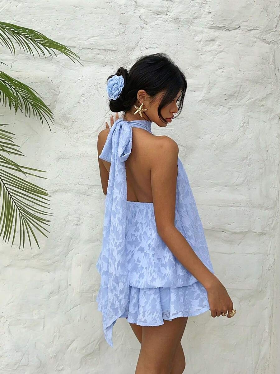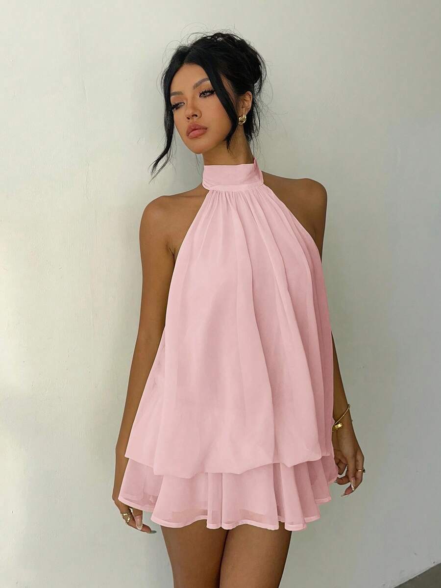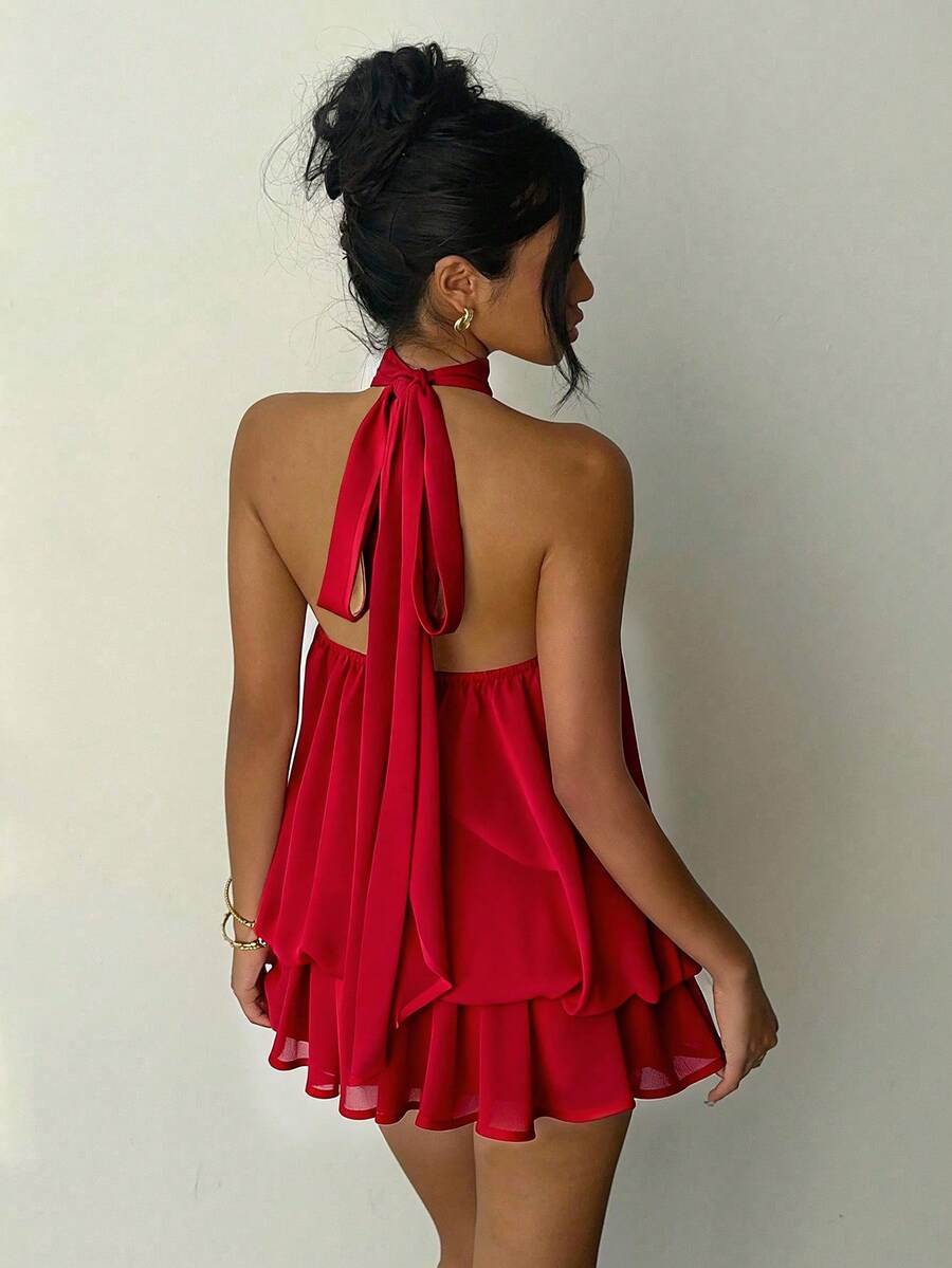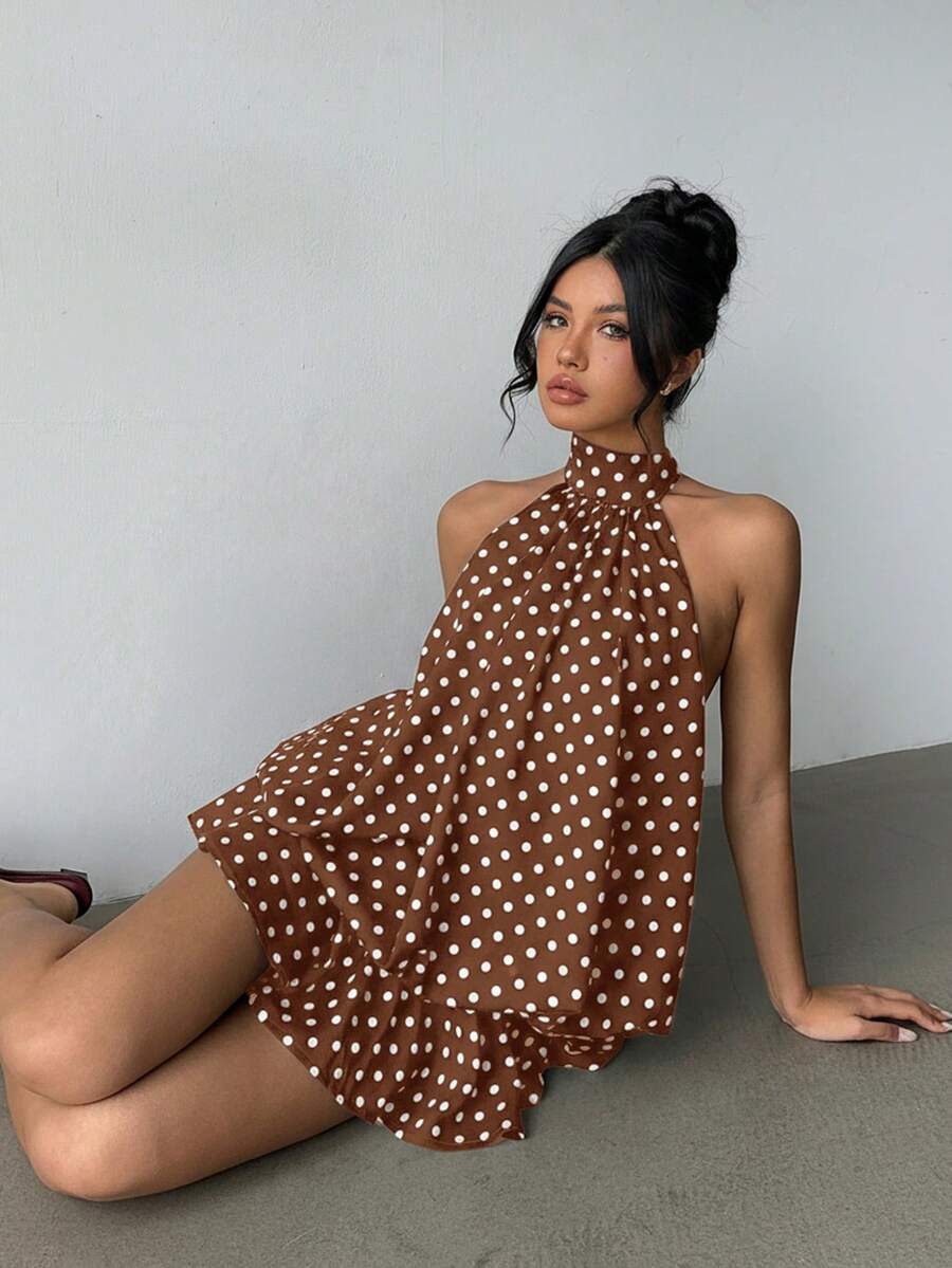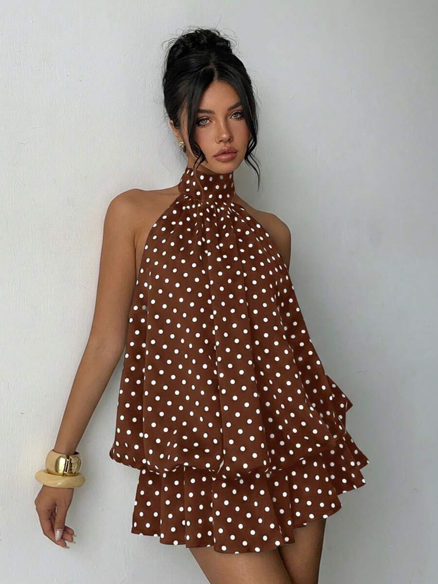 Aloruh Women's Elegant Brown Halter Tie Mini Dress