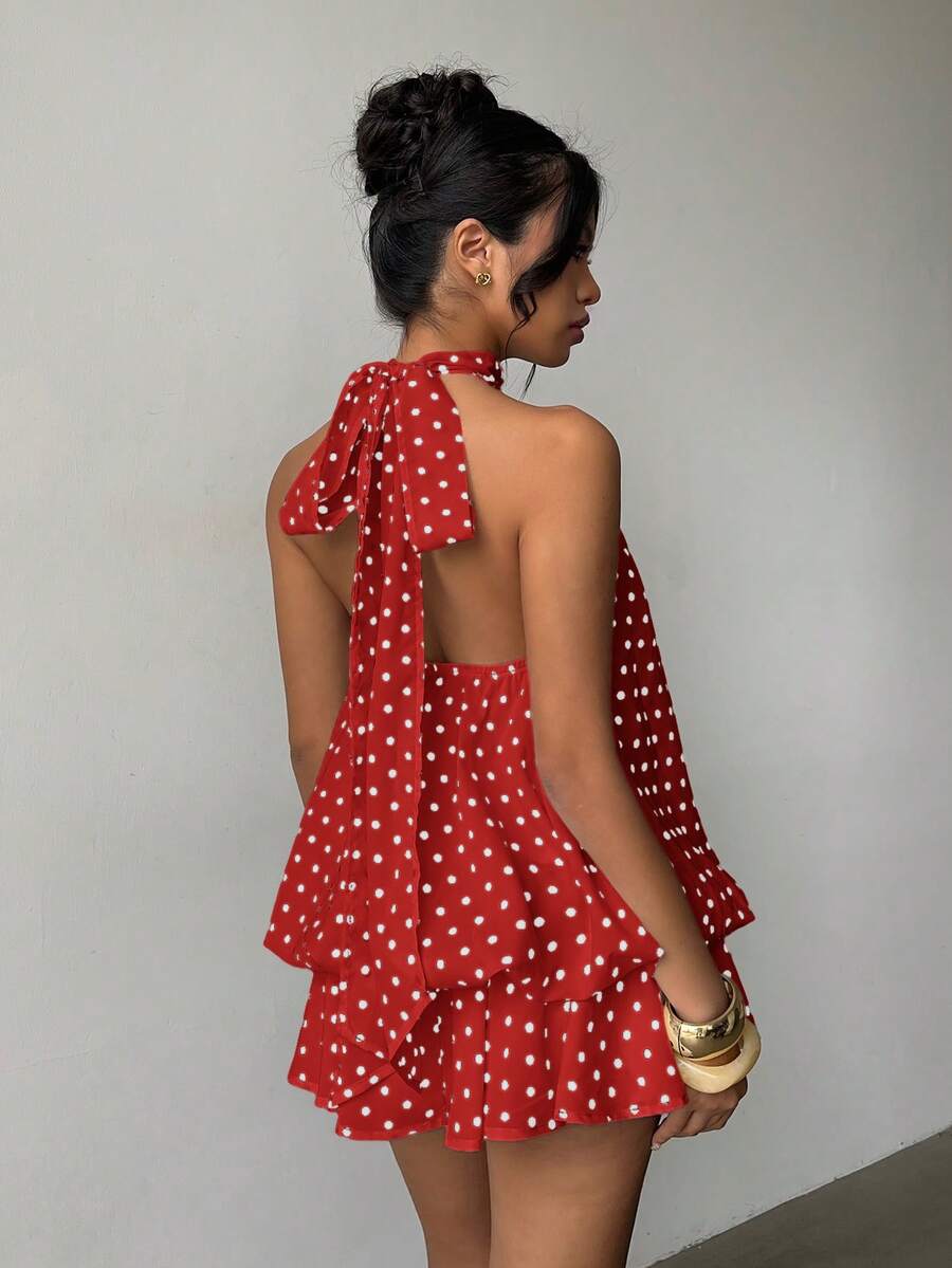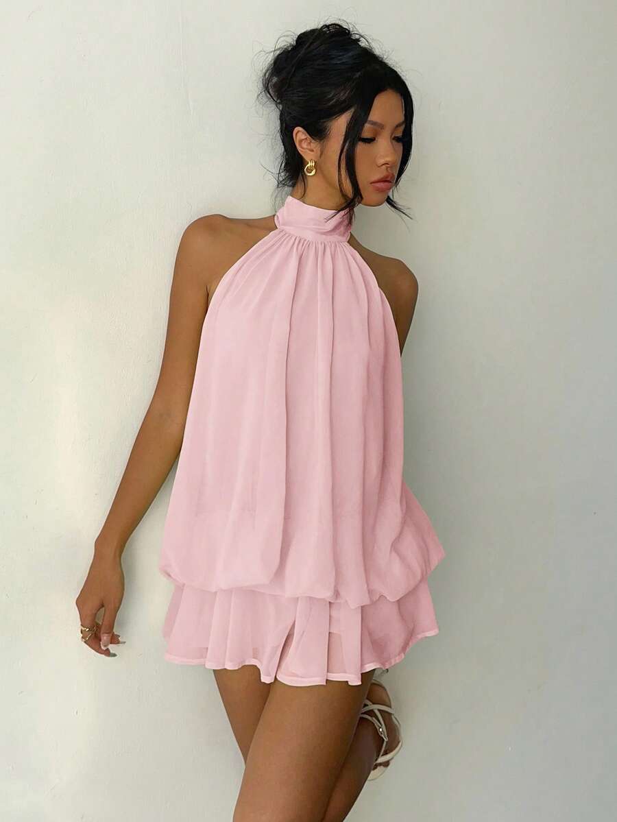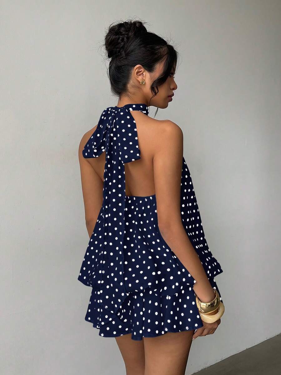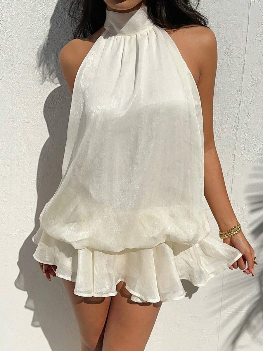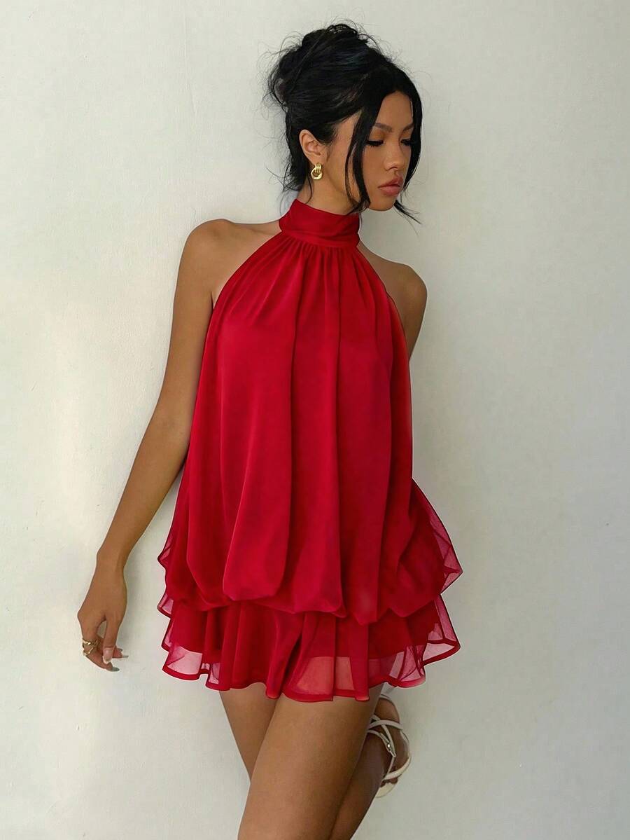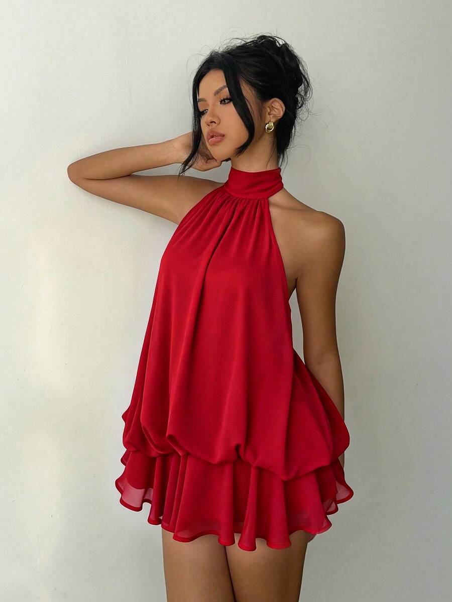 Aloruh Women's Elegant Brown Halter Tie Mini Dress