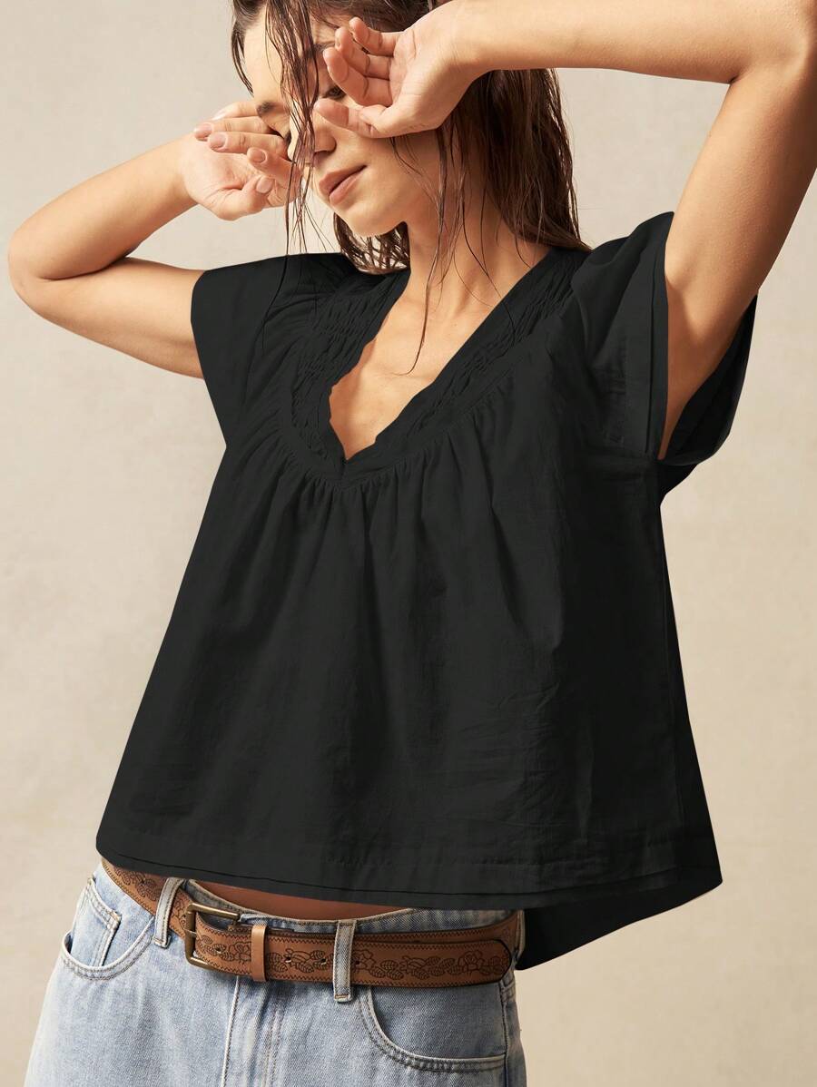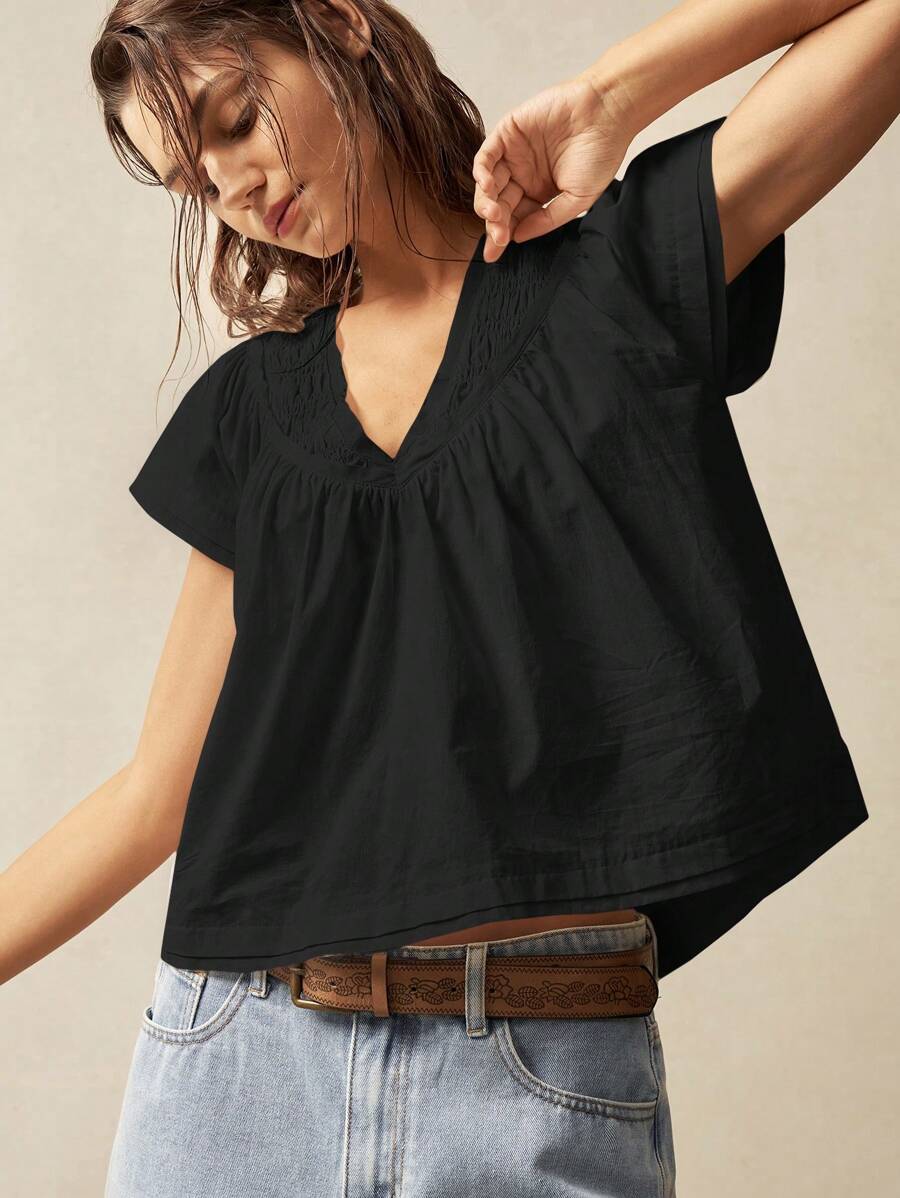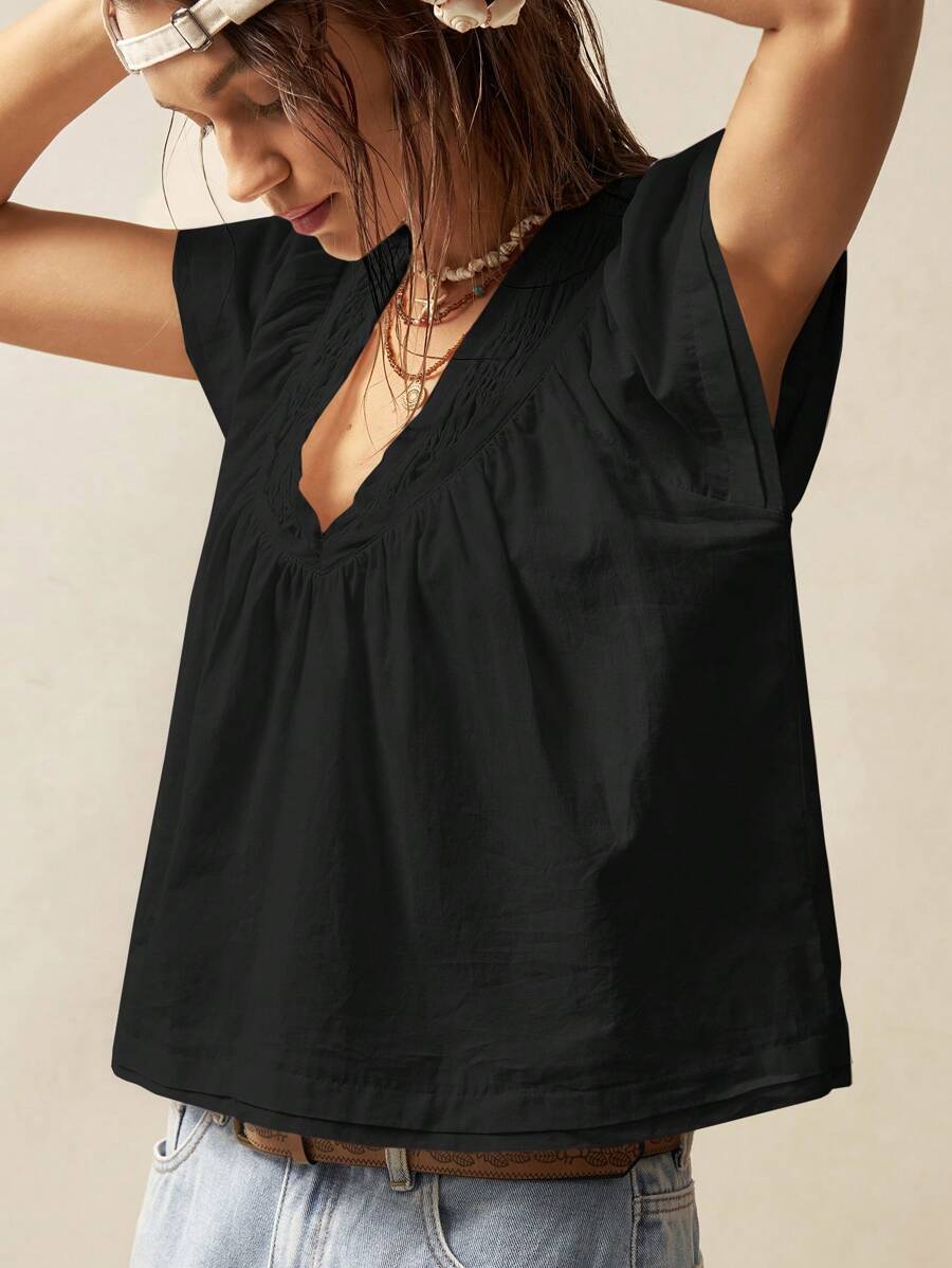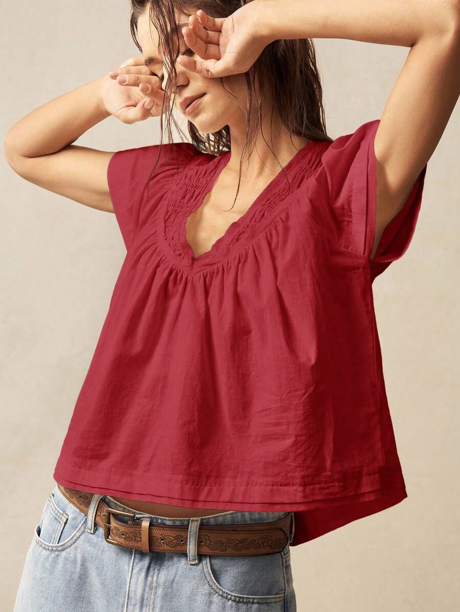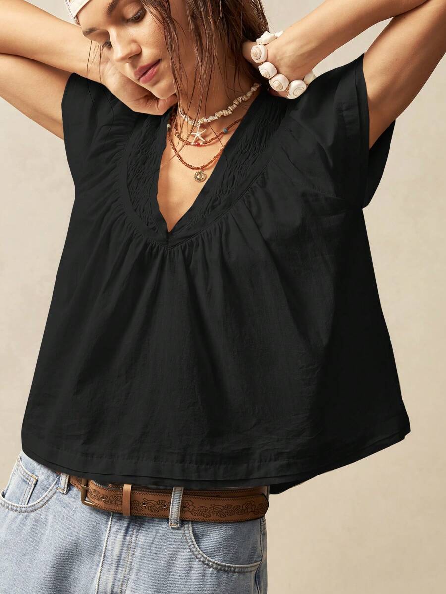 Bohemela Solid Color V-Neck Loose Fit Women Blouse