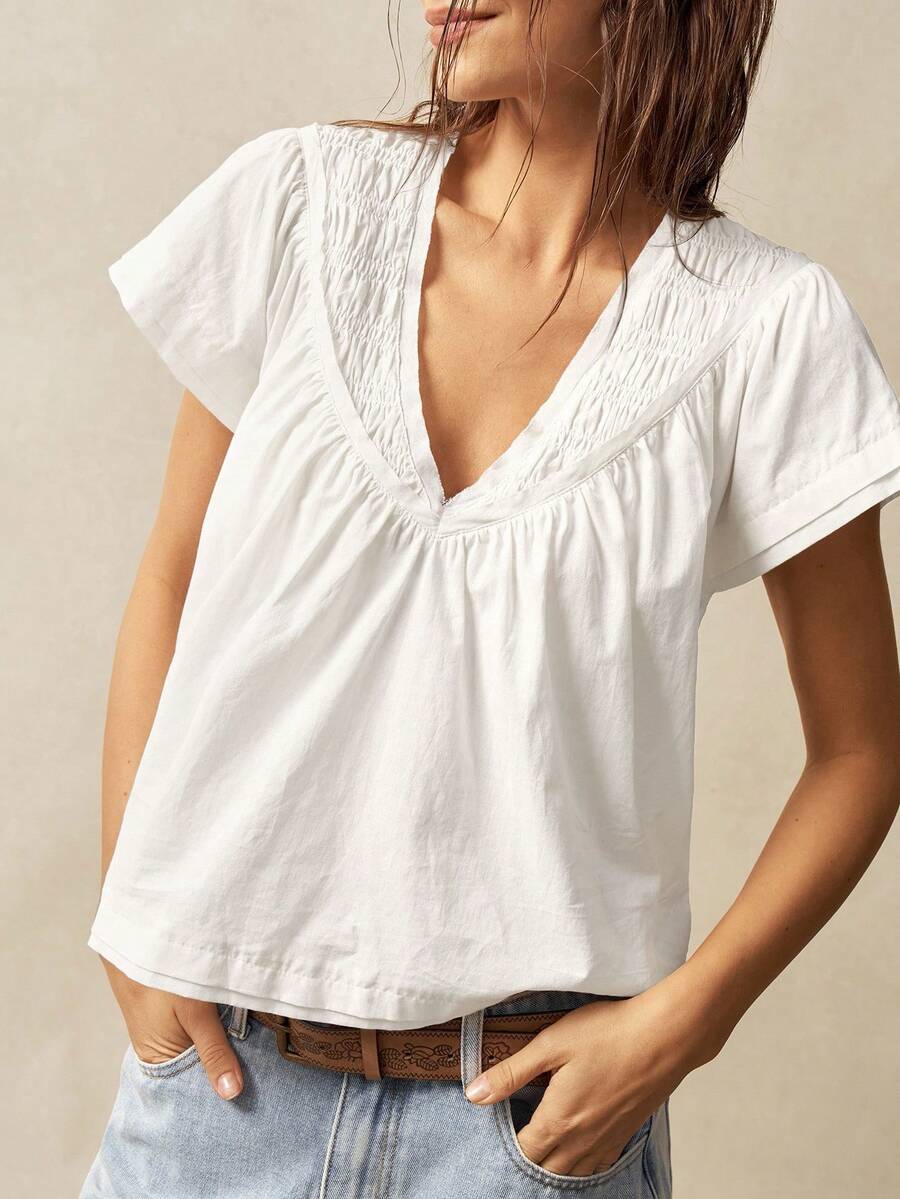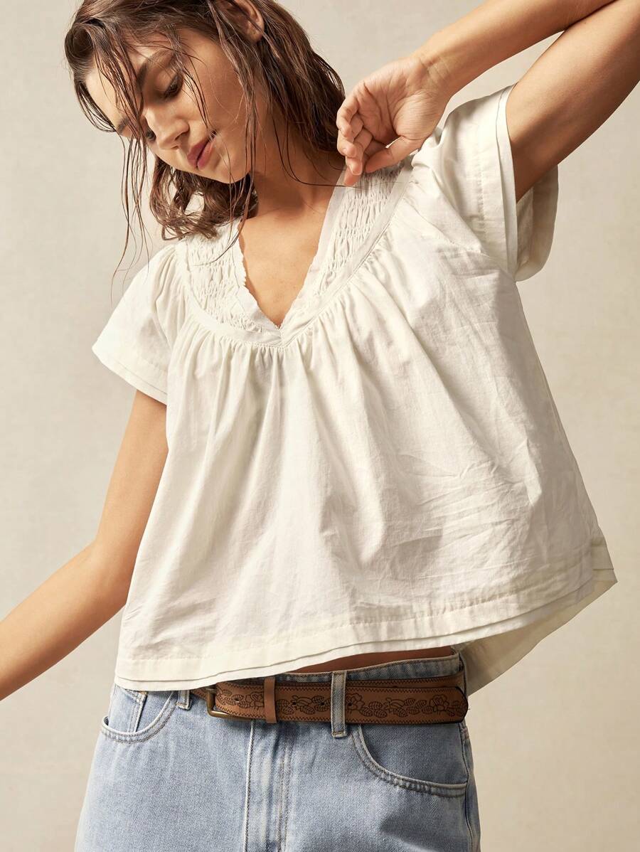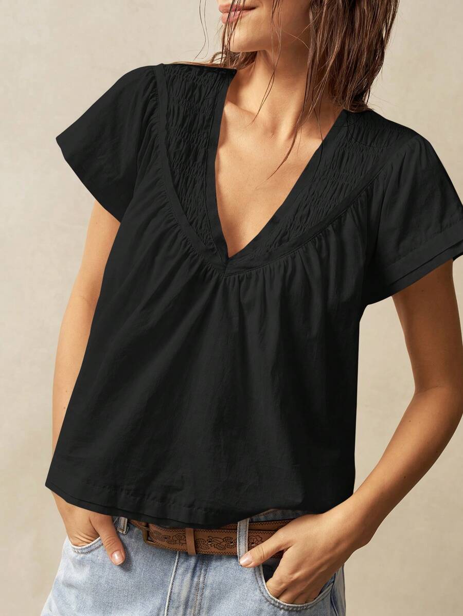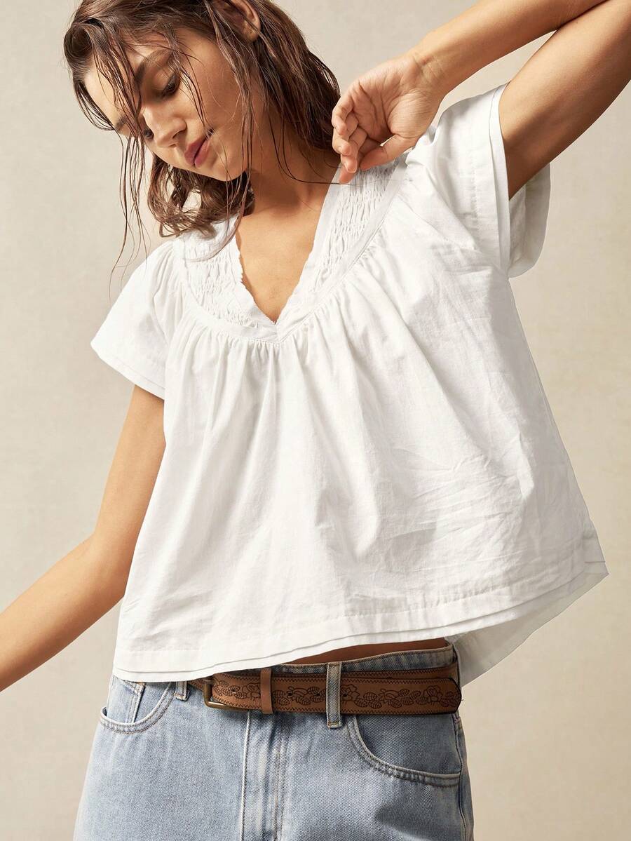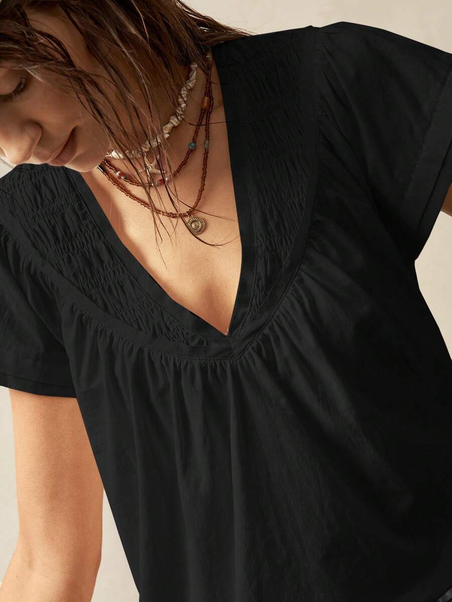 Bohemela Solid Color V-Neck Loose Fit Women Blouse