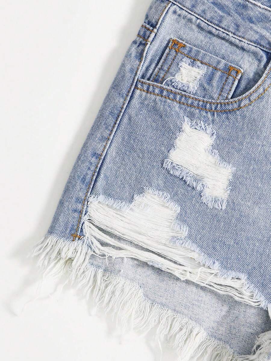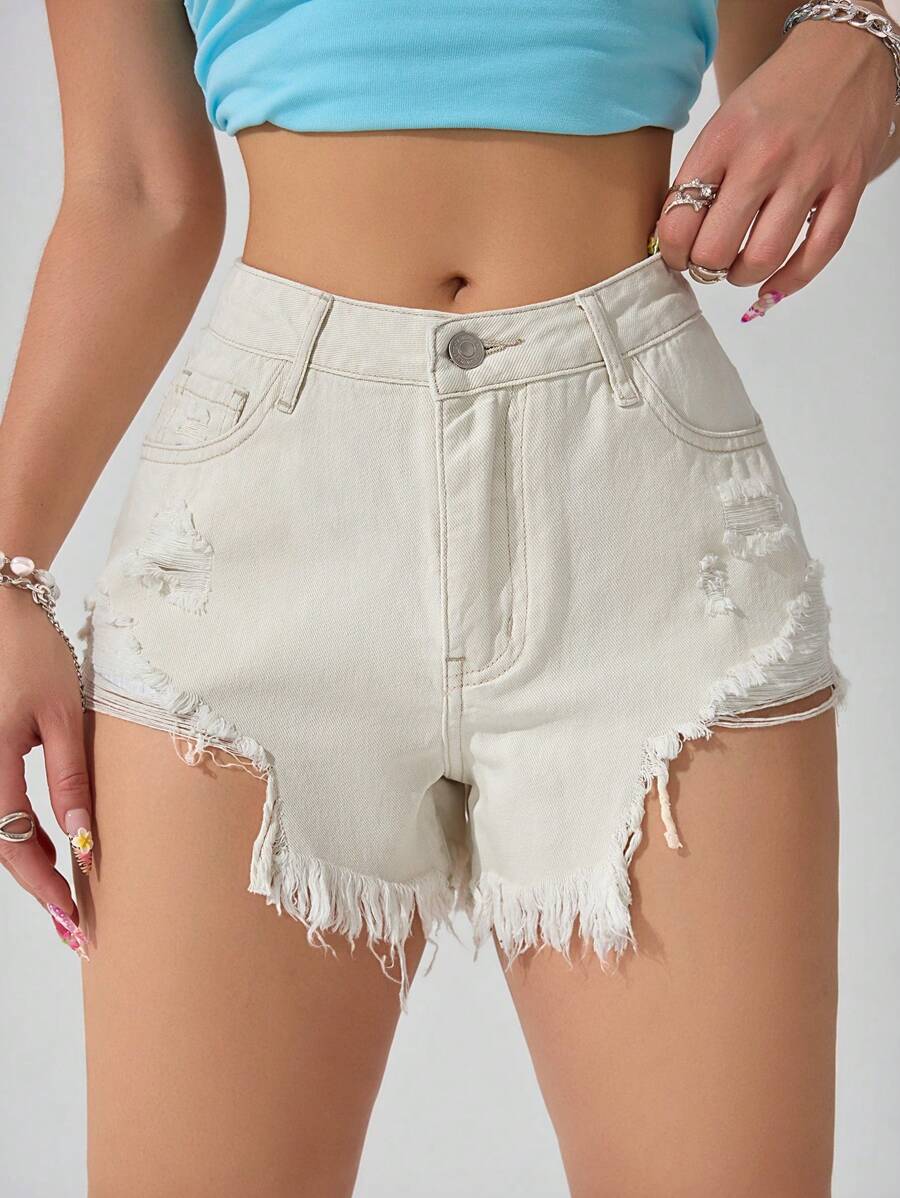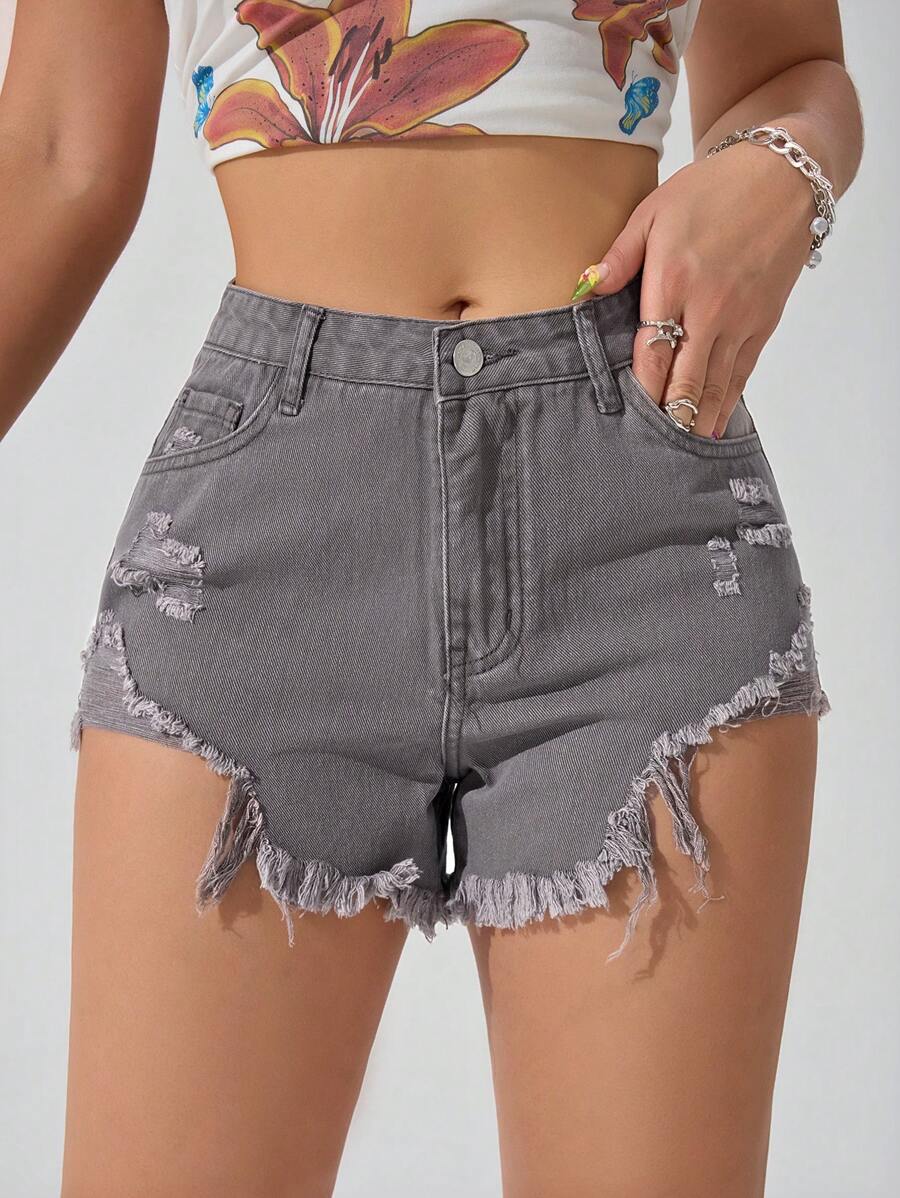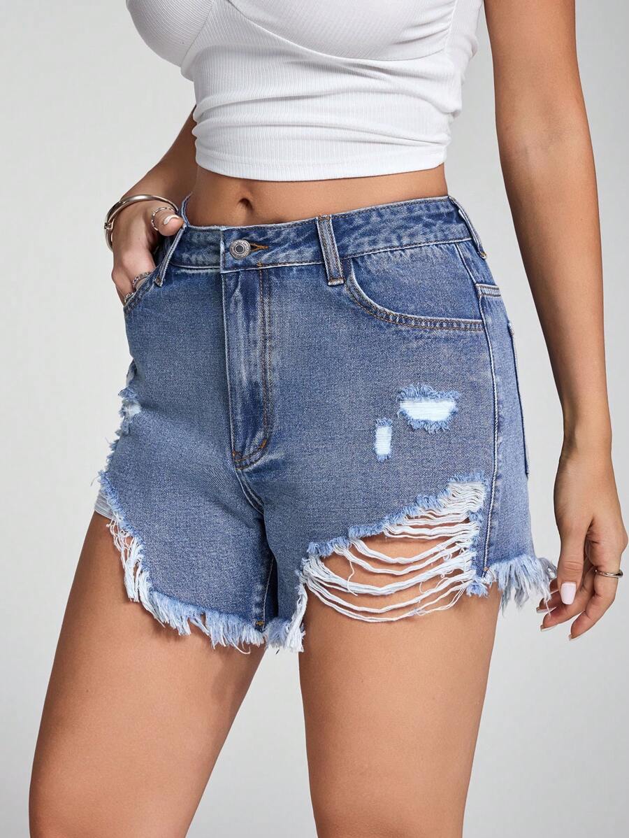 SHEIN EZwear Women Ripped Fringe Hem Everyday Denim Shorts Y2k
